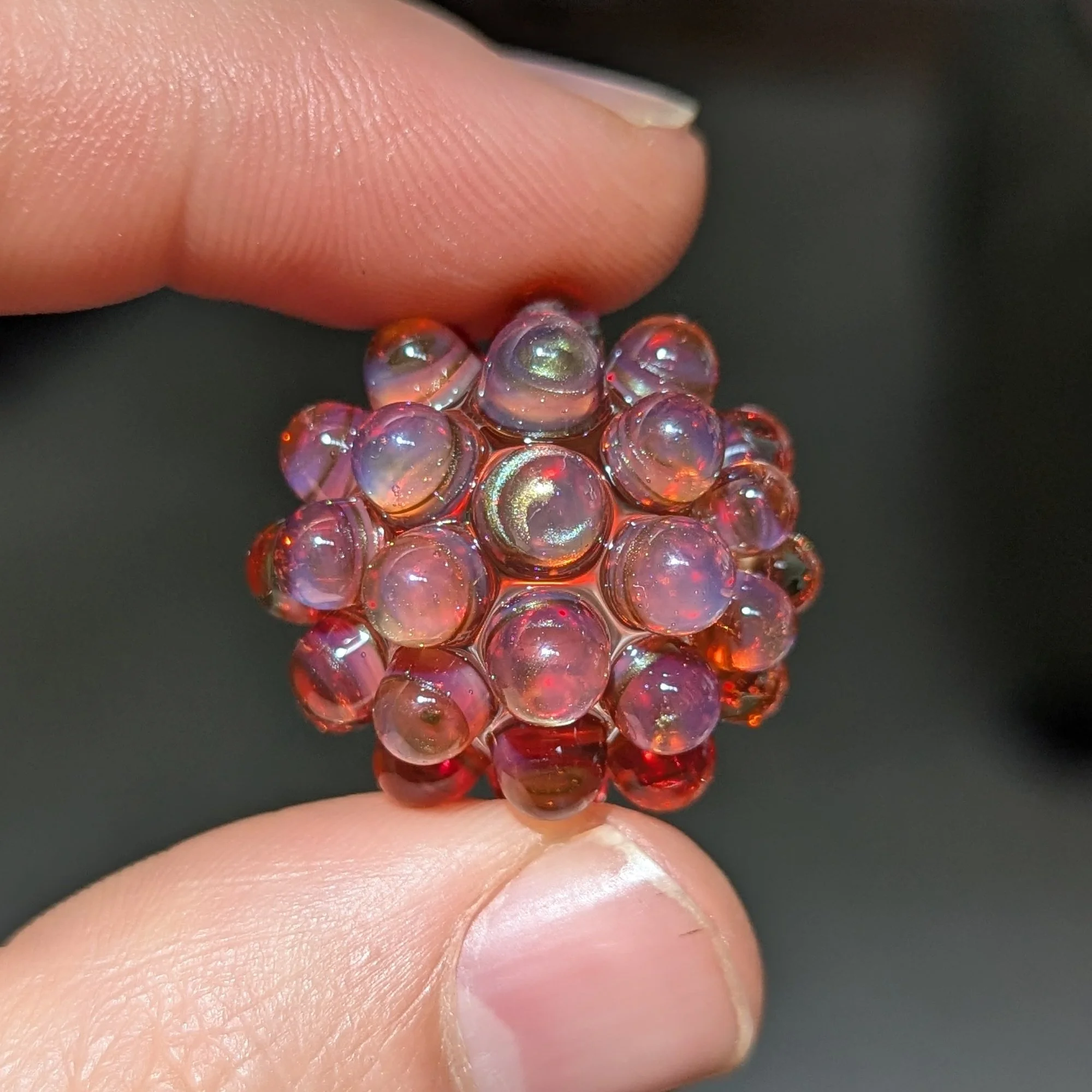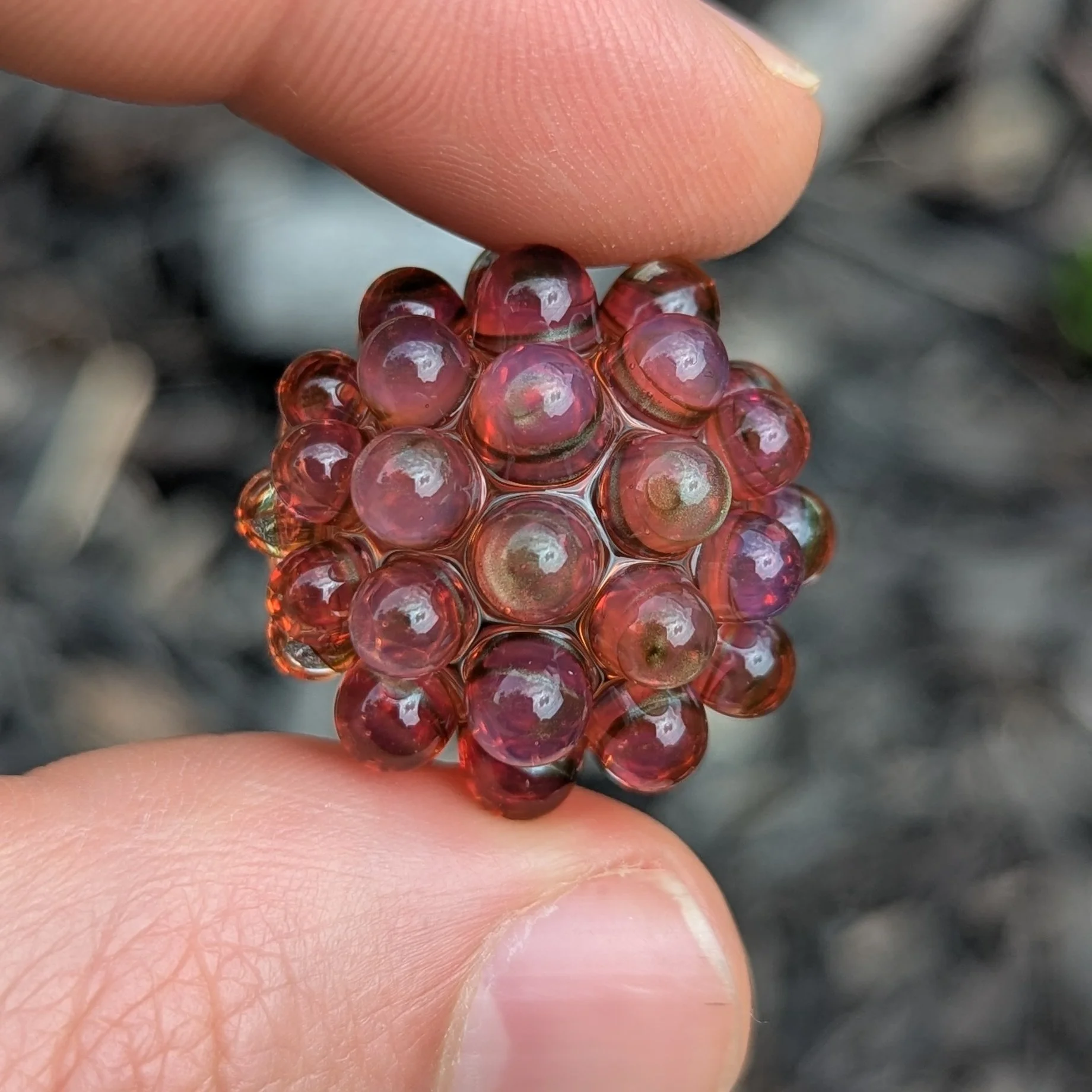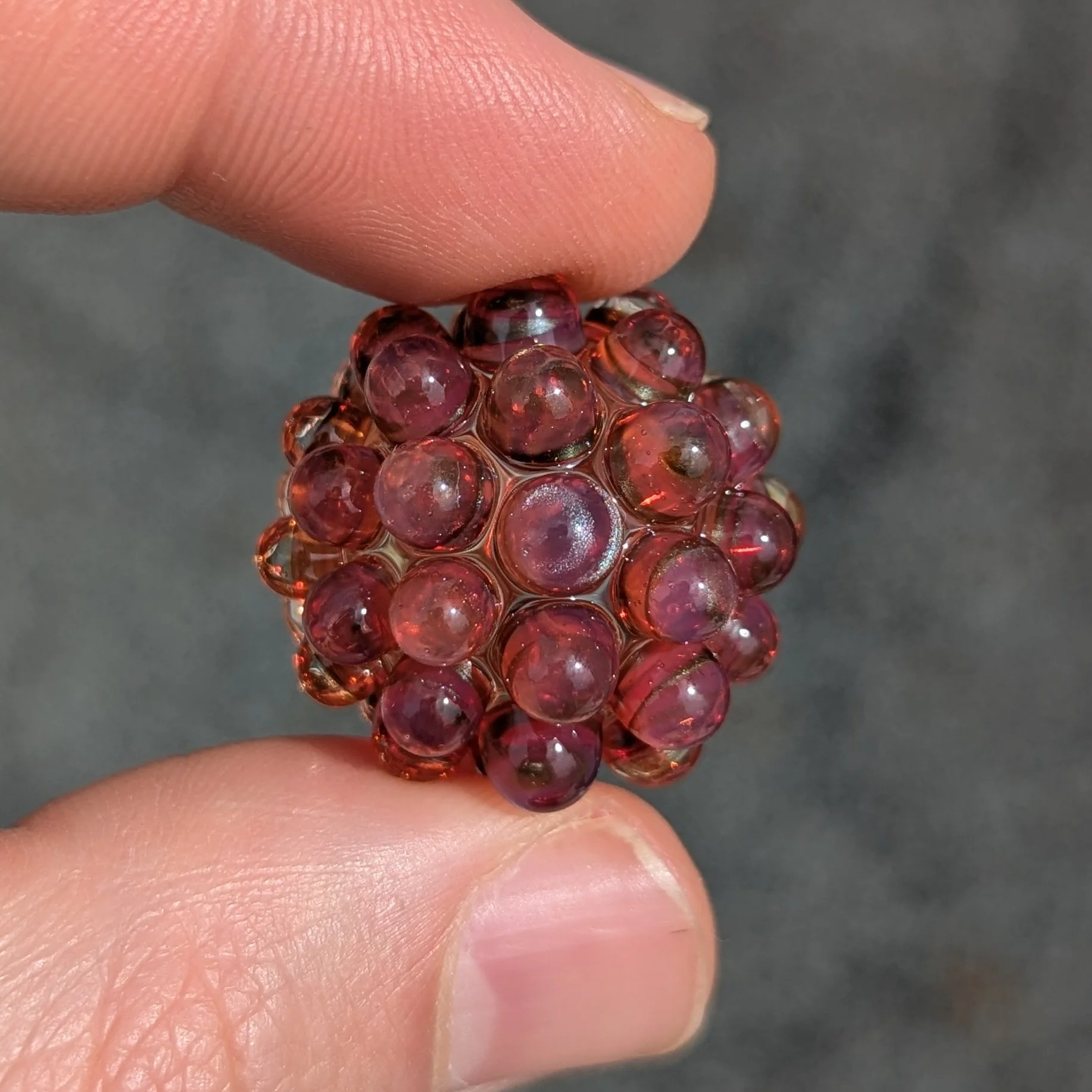 Clear core with 44 dark shimmering red brown hobnails that remind me of dr pepper.
