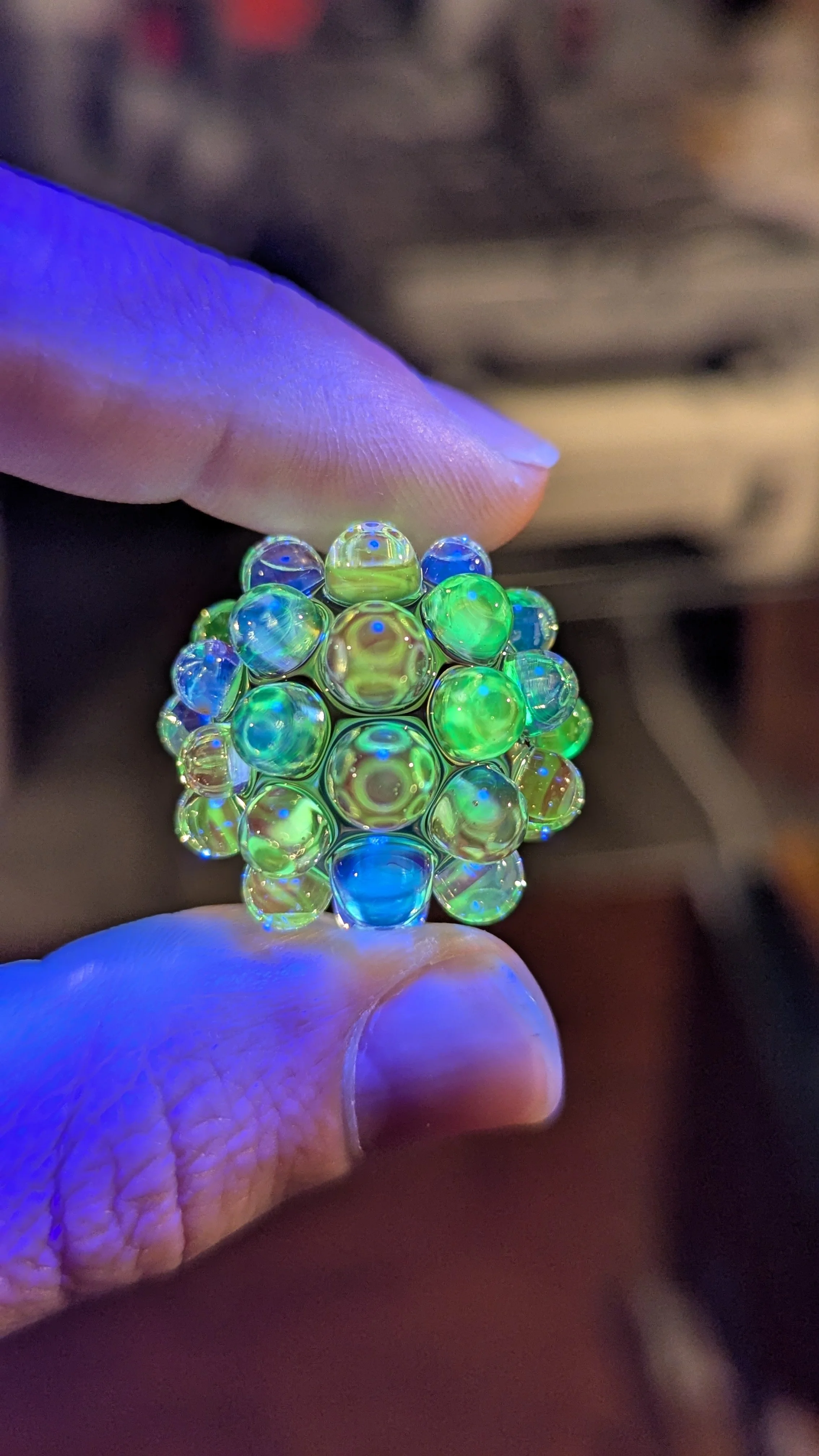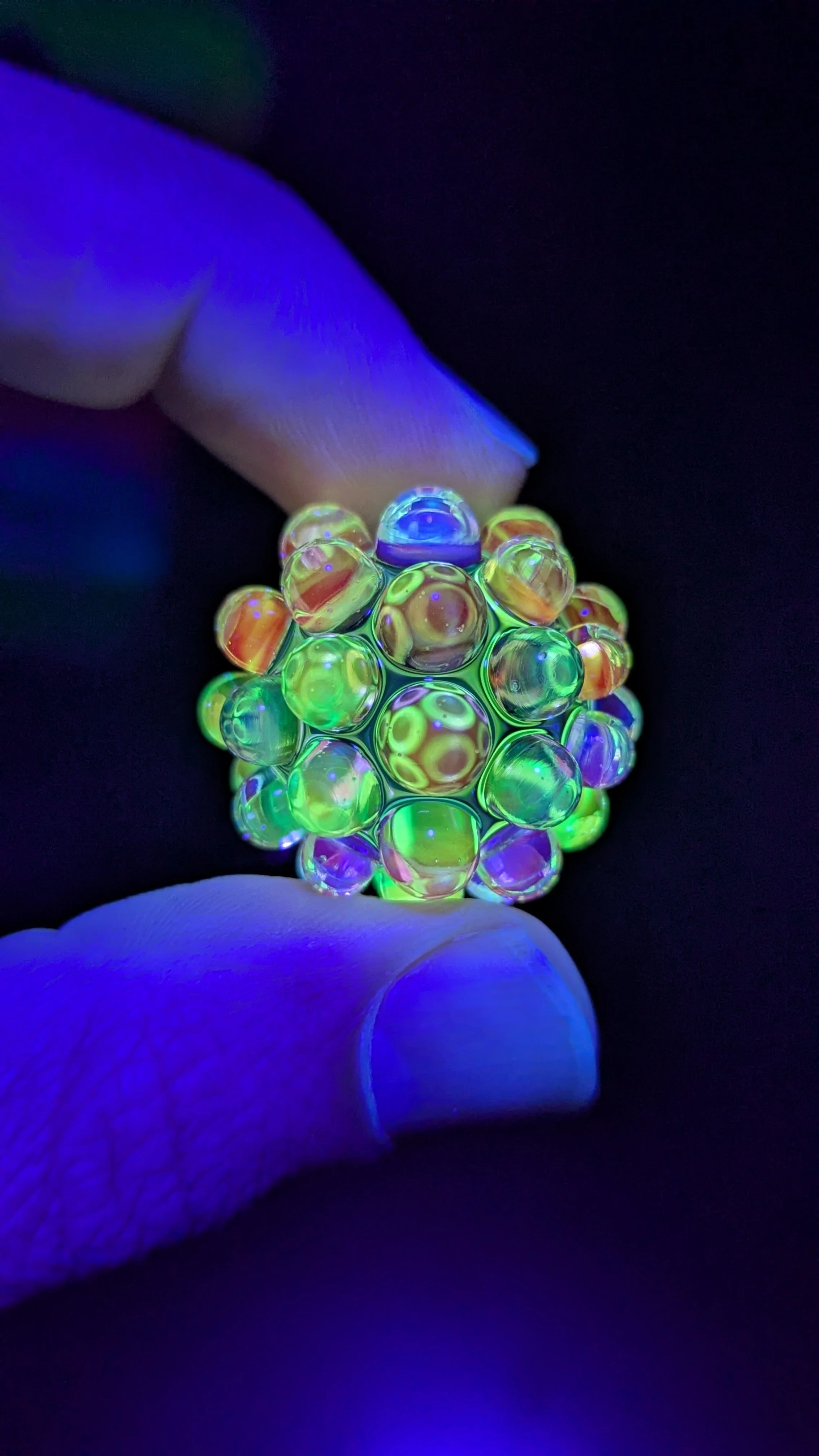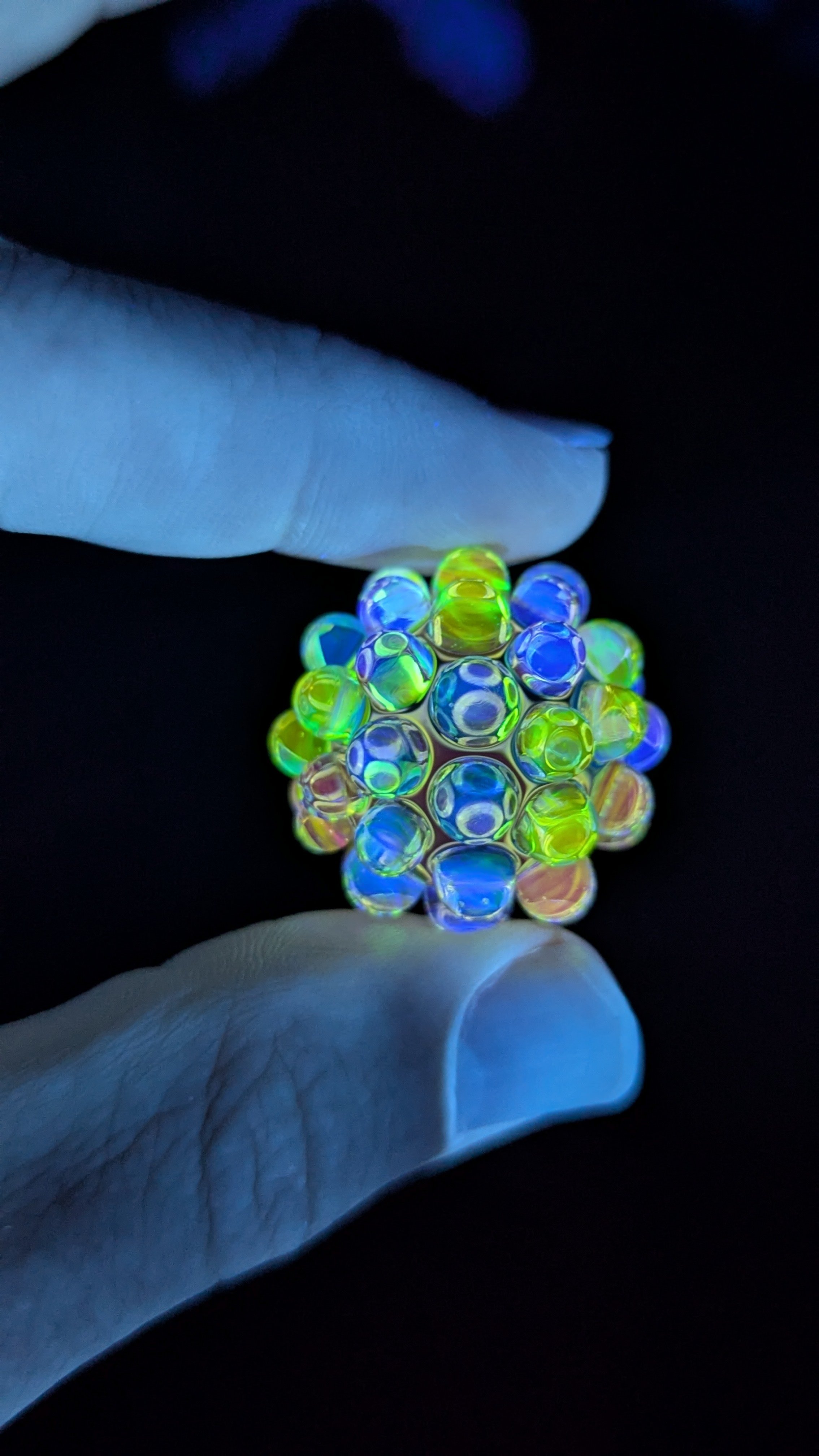 Multicolor UV core with 44 mostly clear hobnails and a light green tint. I used some hand mixed UV colors to create some unique shades. I love the yellow/green shade. I included photos with both 365nm and 395nm light to show the difference.