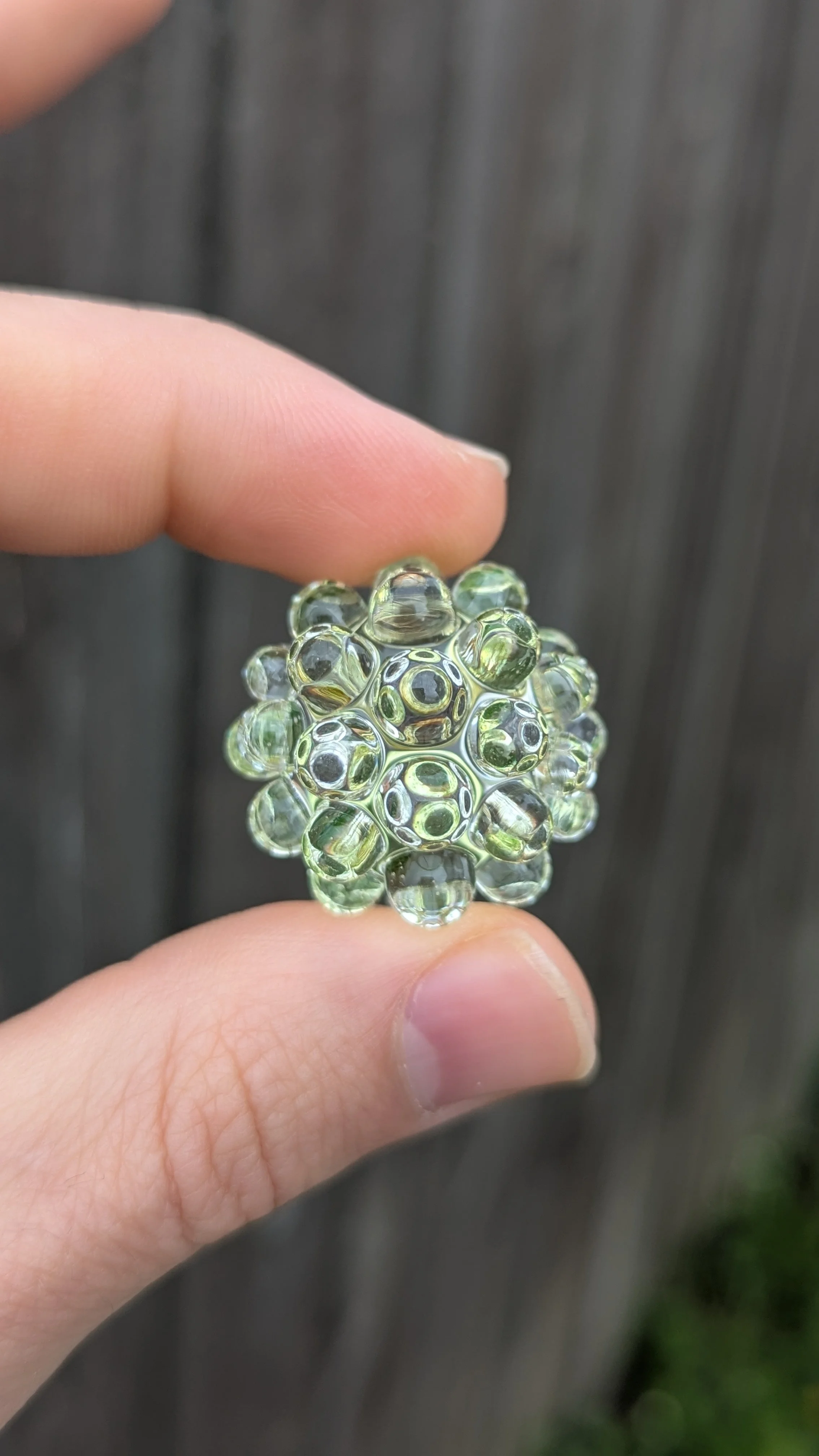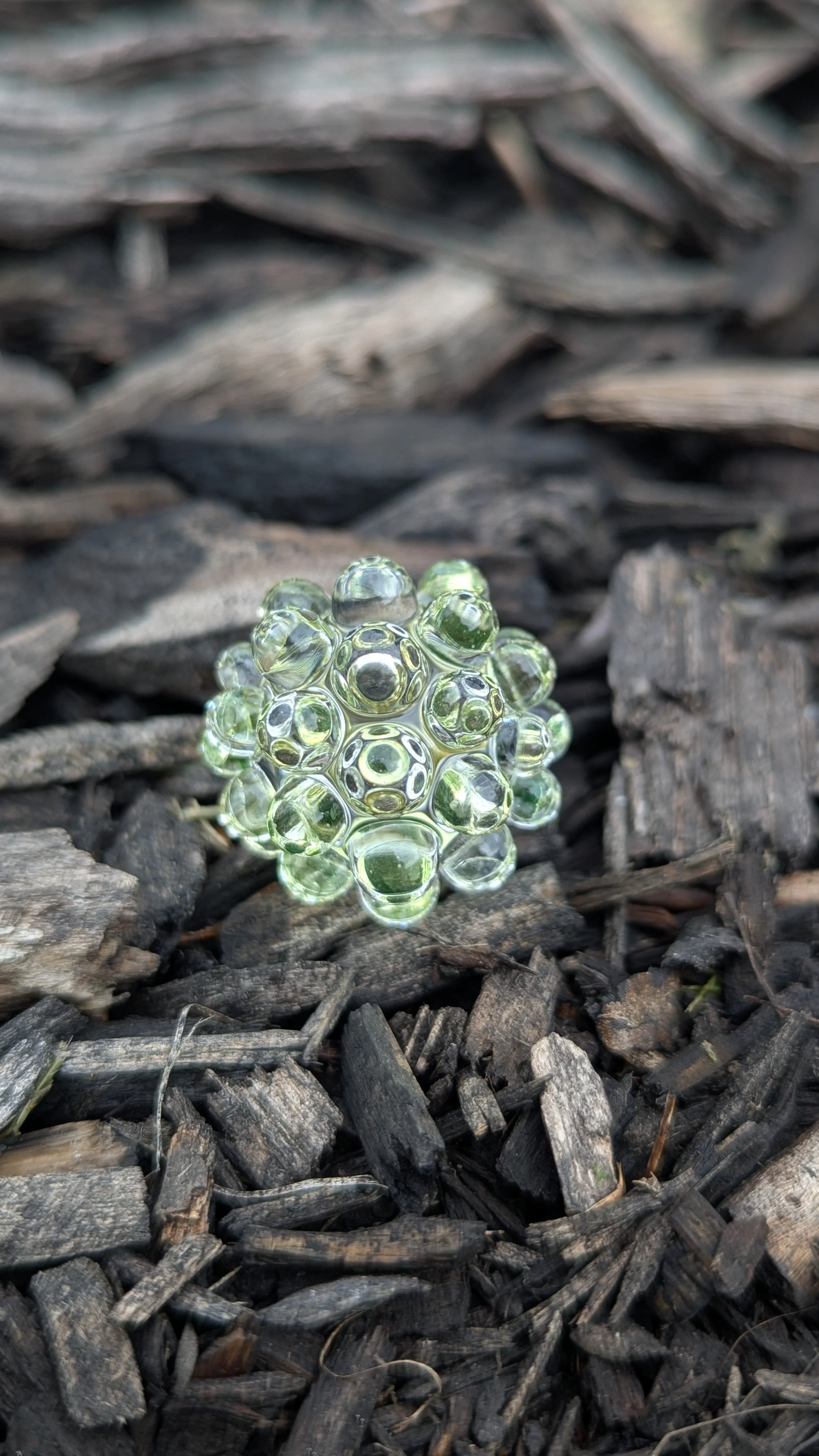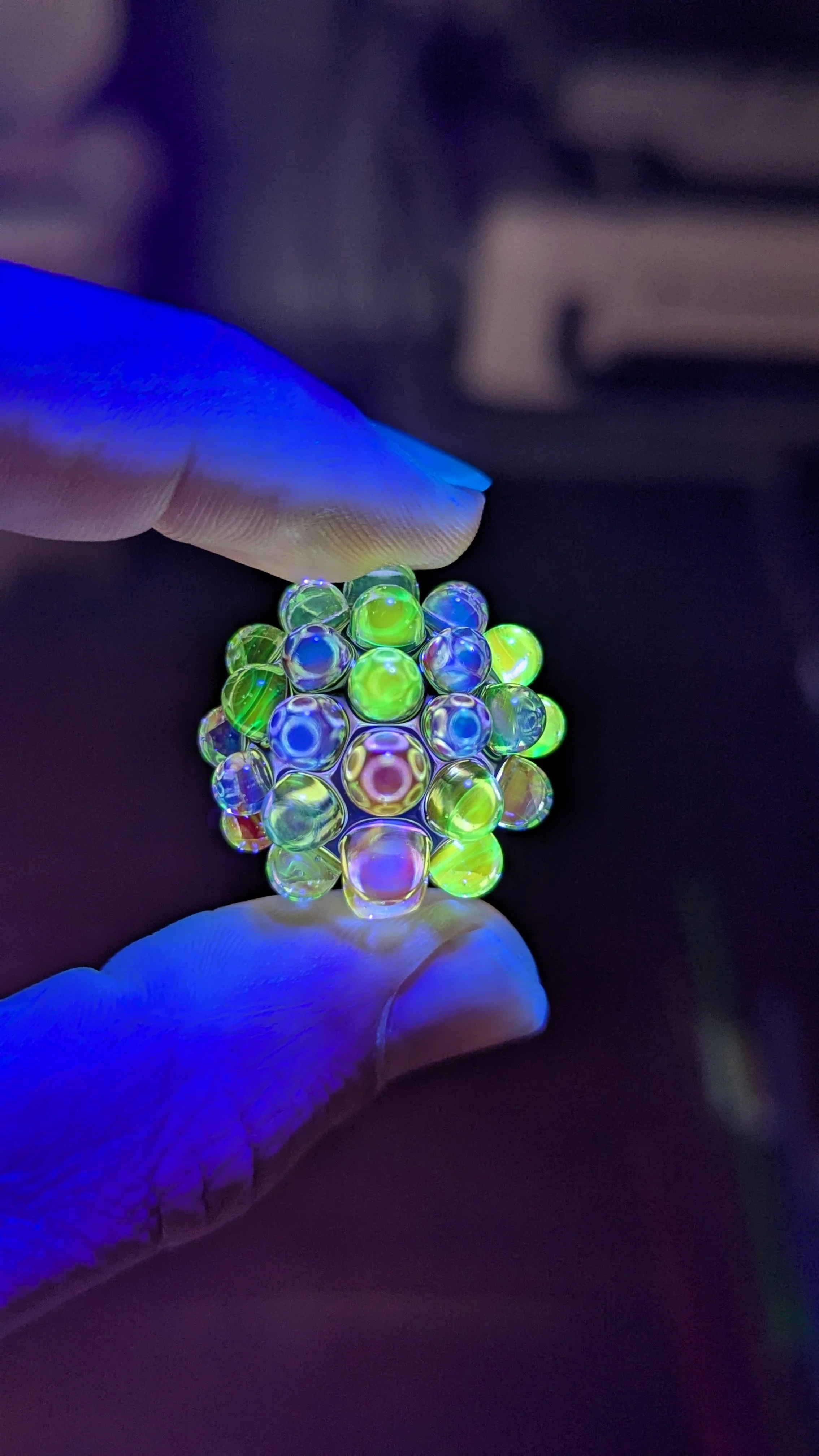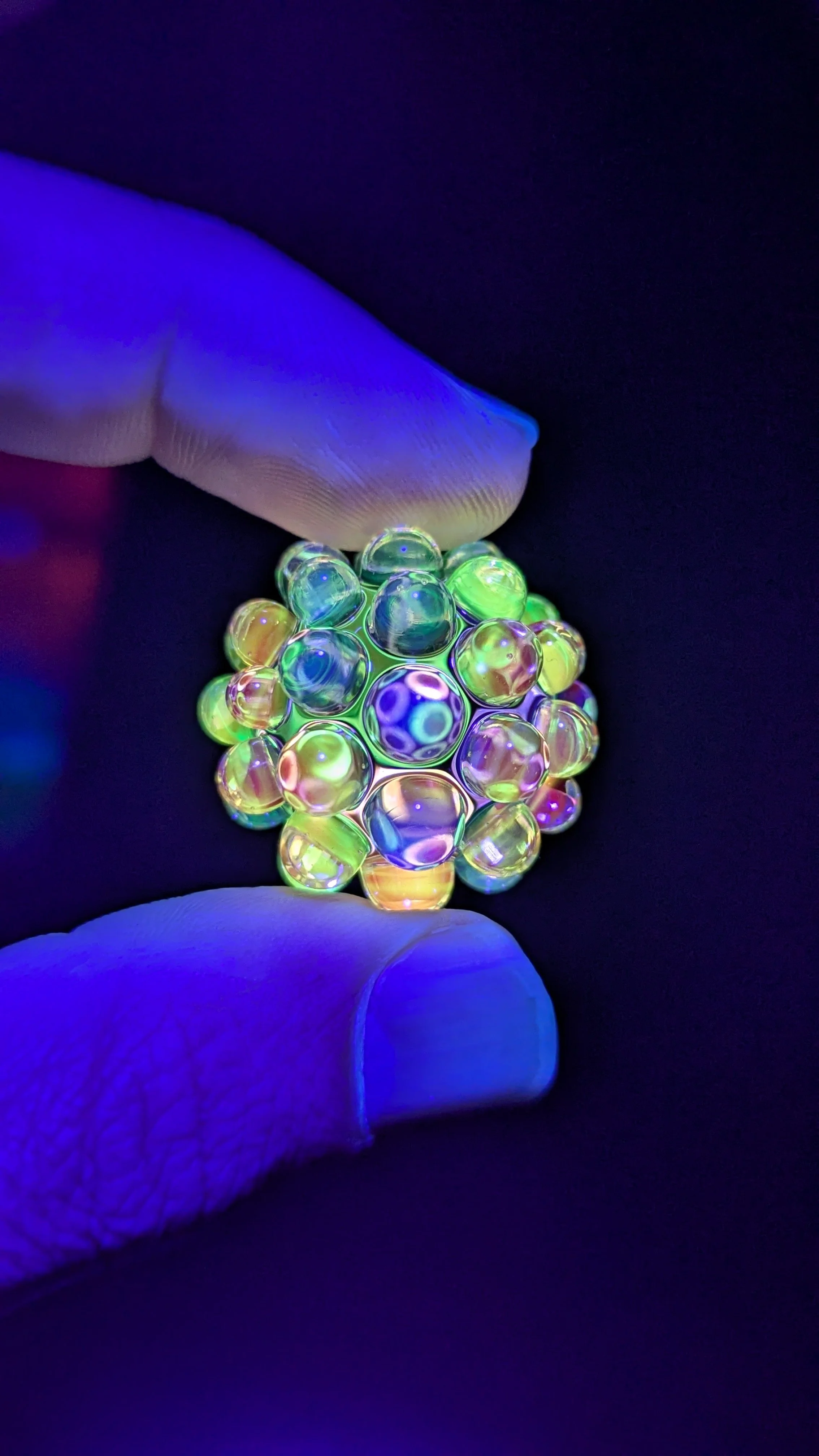 Multicolor UV core with 44 mostly clear hobnails and a light green tint. I used some hand mixed UV colors to create some unique shades. I love the yellow/green shade. I included photos with both 365nm and 395nm light to show the difference.