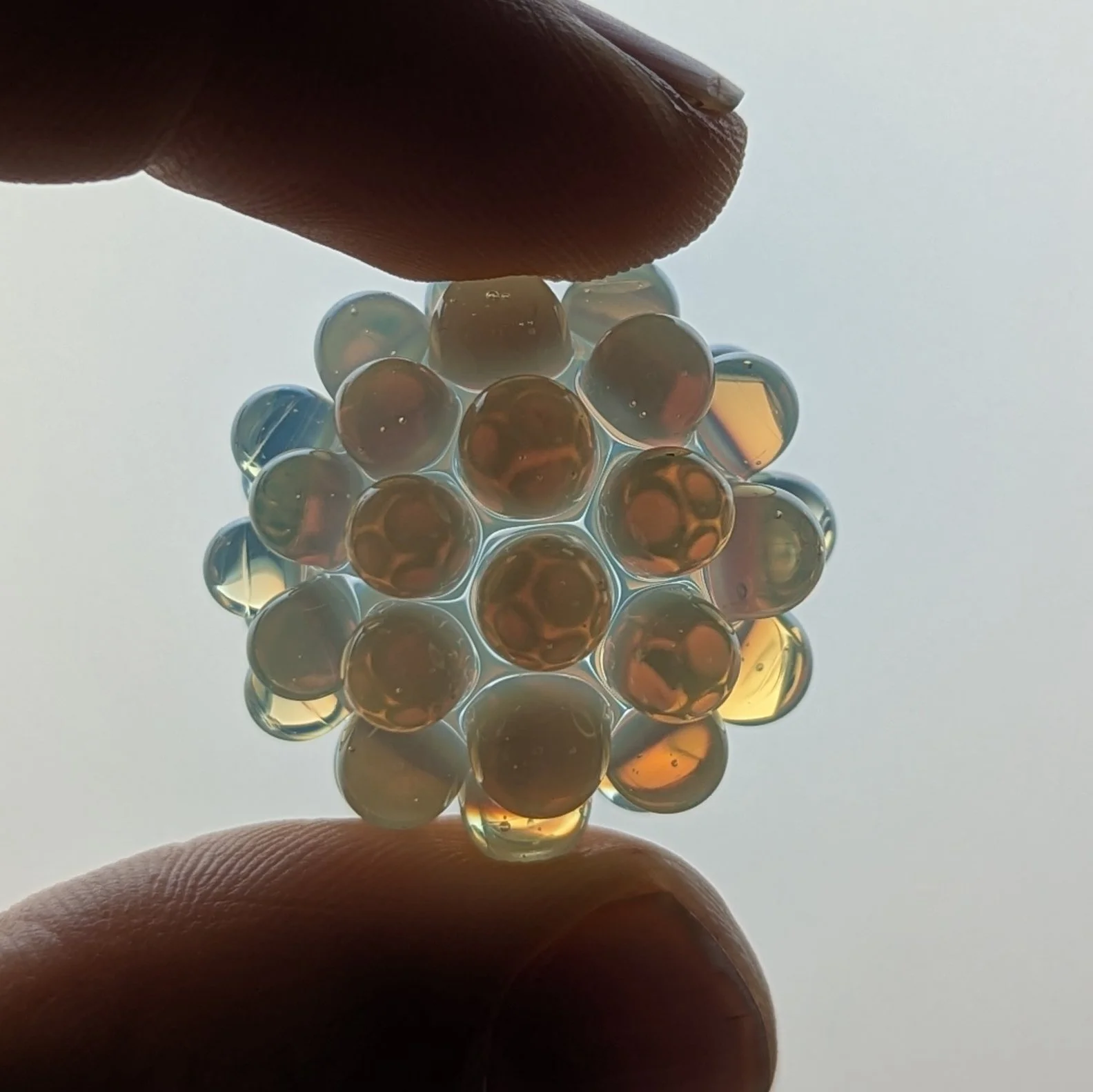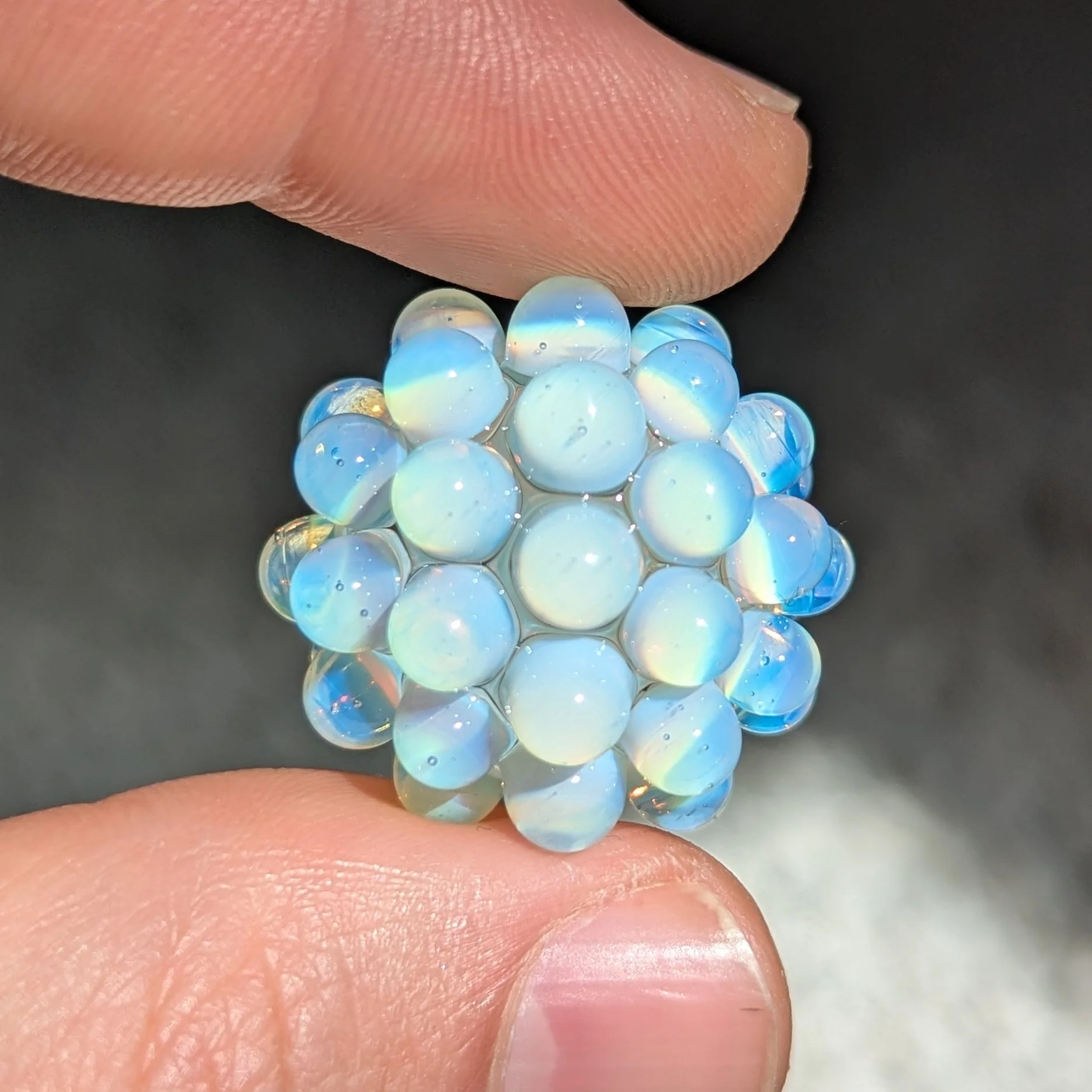 Clear core with opaline hobnail. This is a interesting color which produces subtle color fades; made by greasy glass