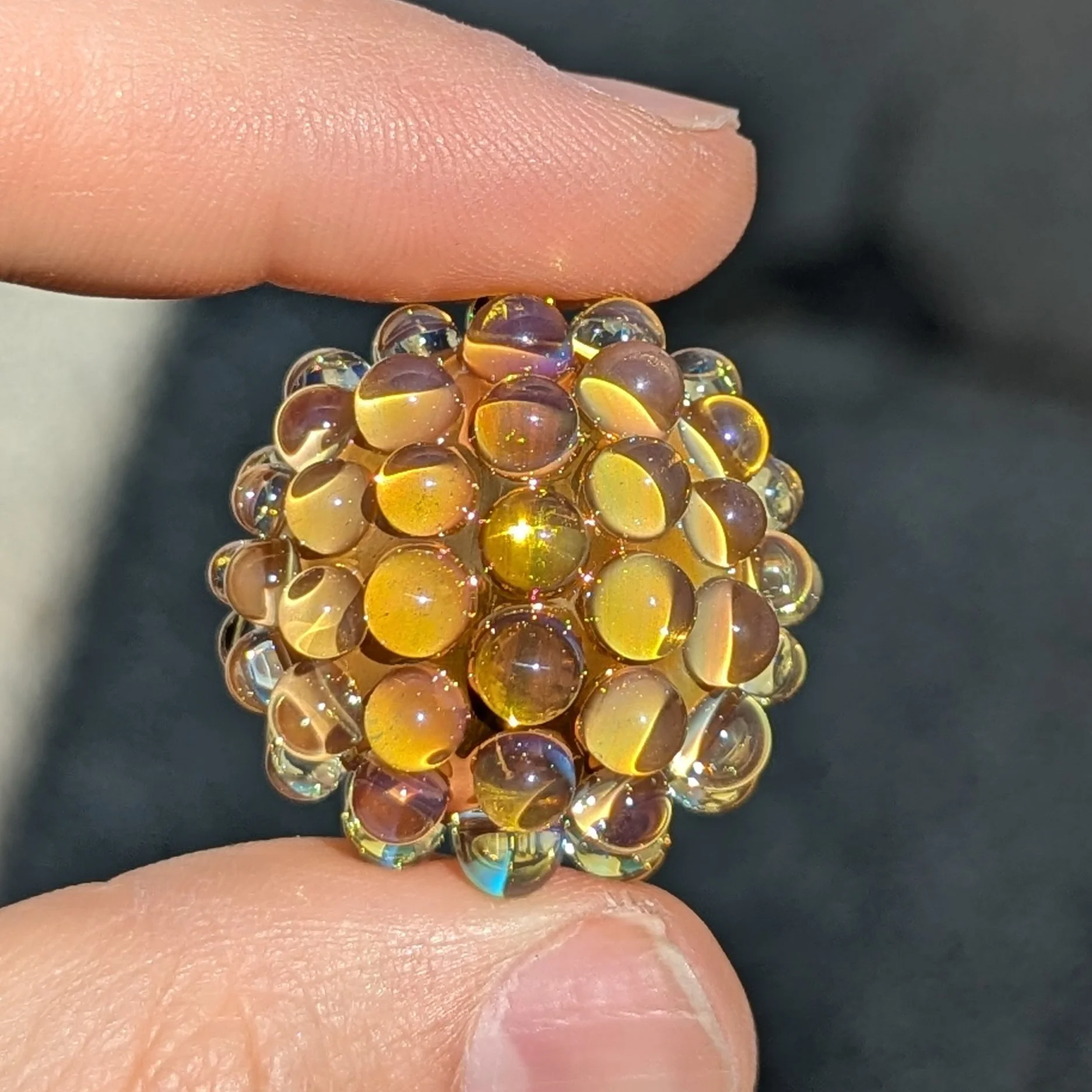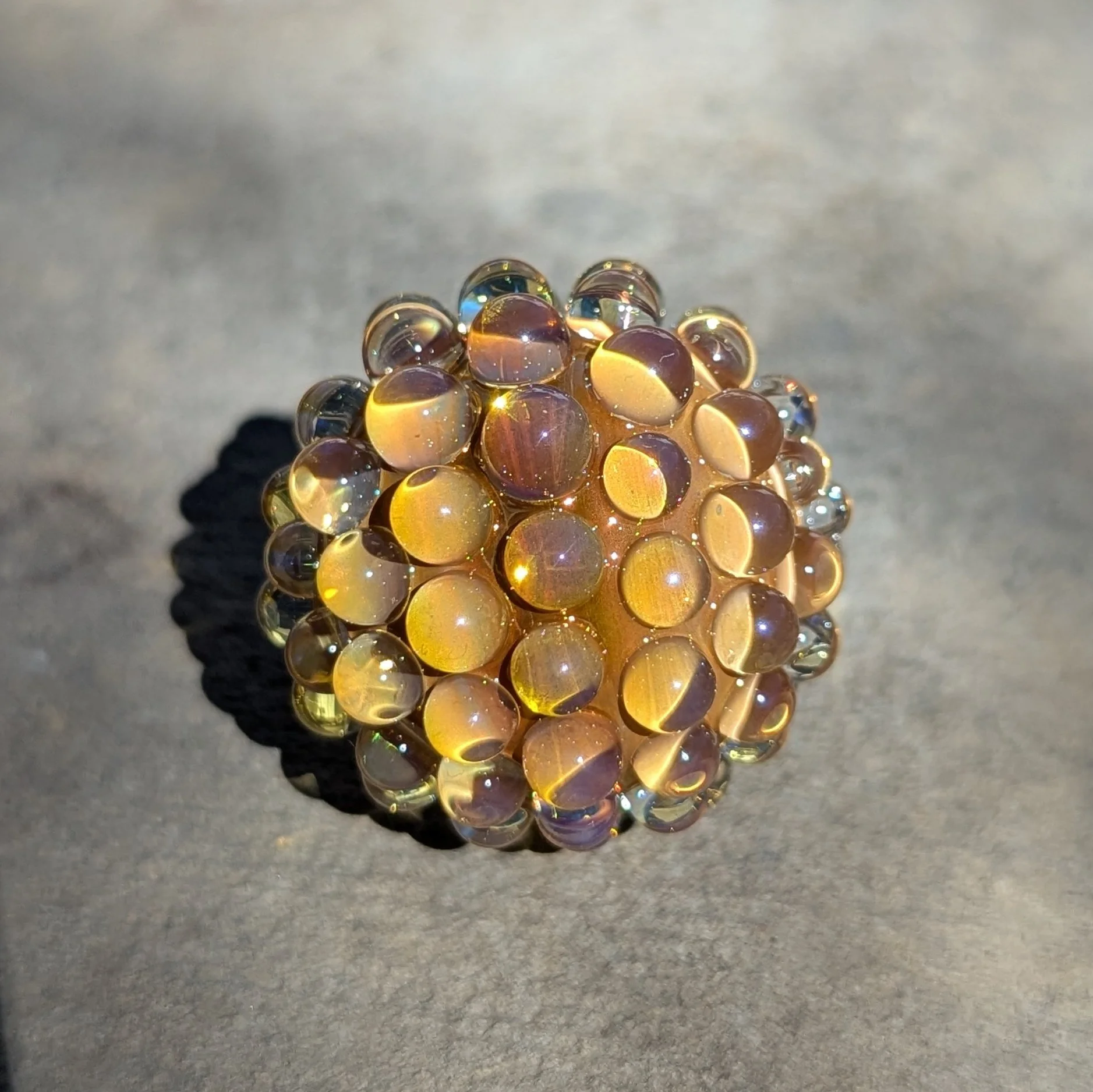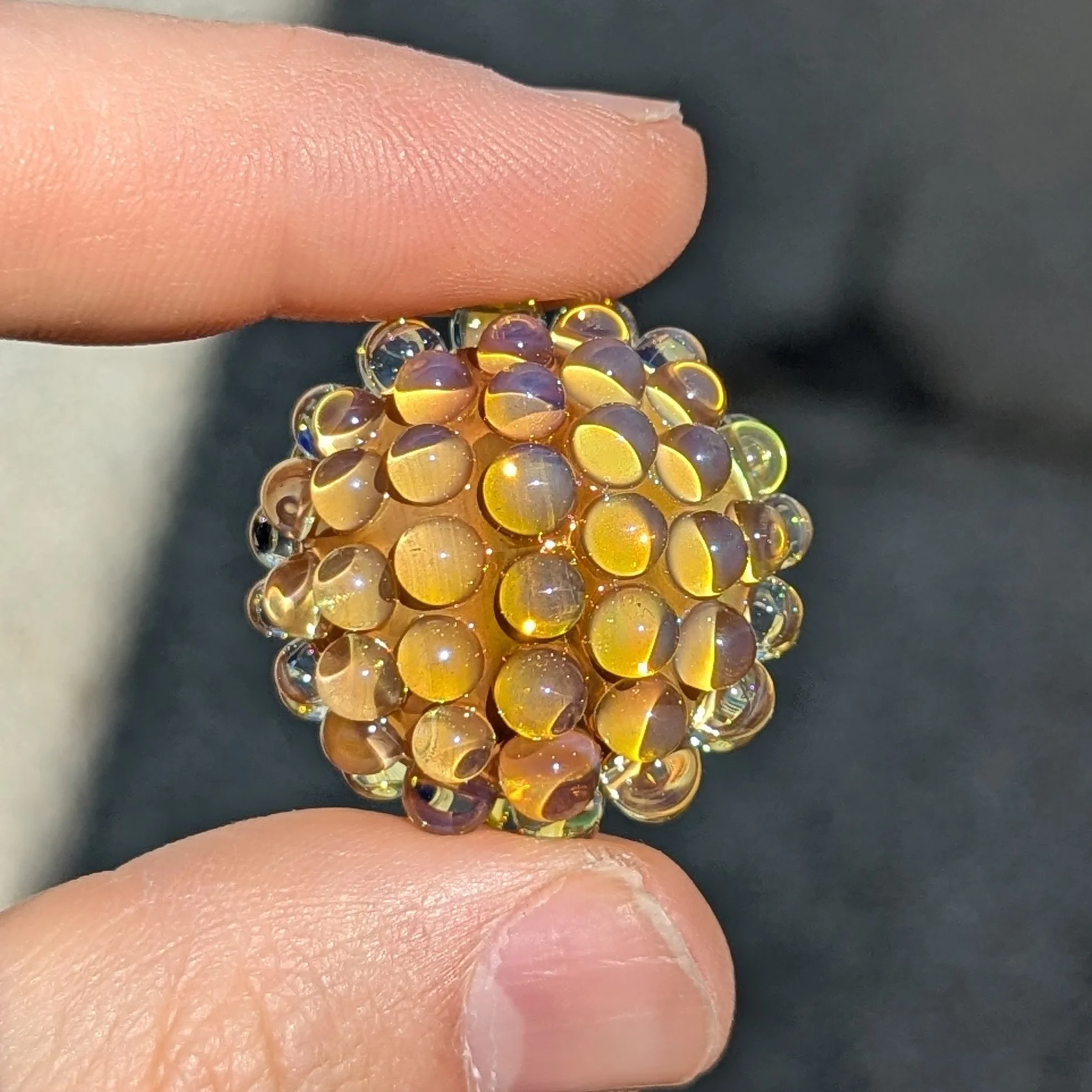 Yellow core with silver fume and extra gold fume. 78 silver fumed transparent yellow hobnails. I included photos with different lighting scenarios.