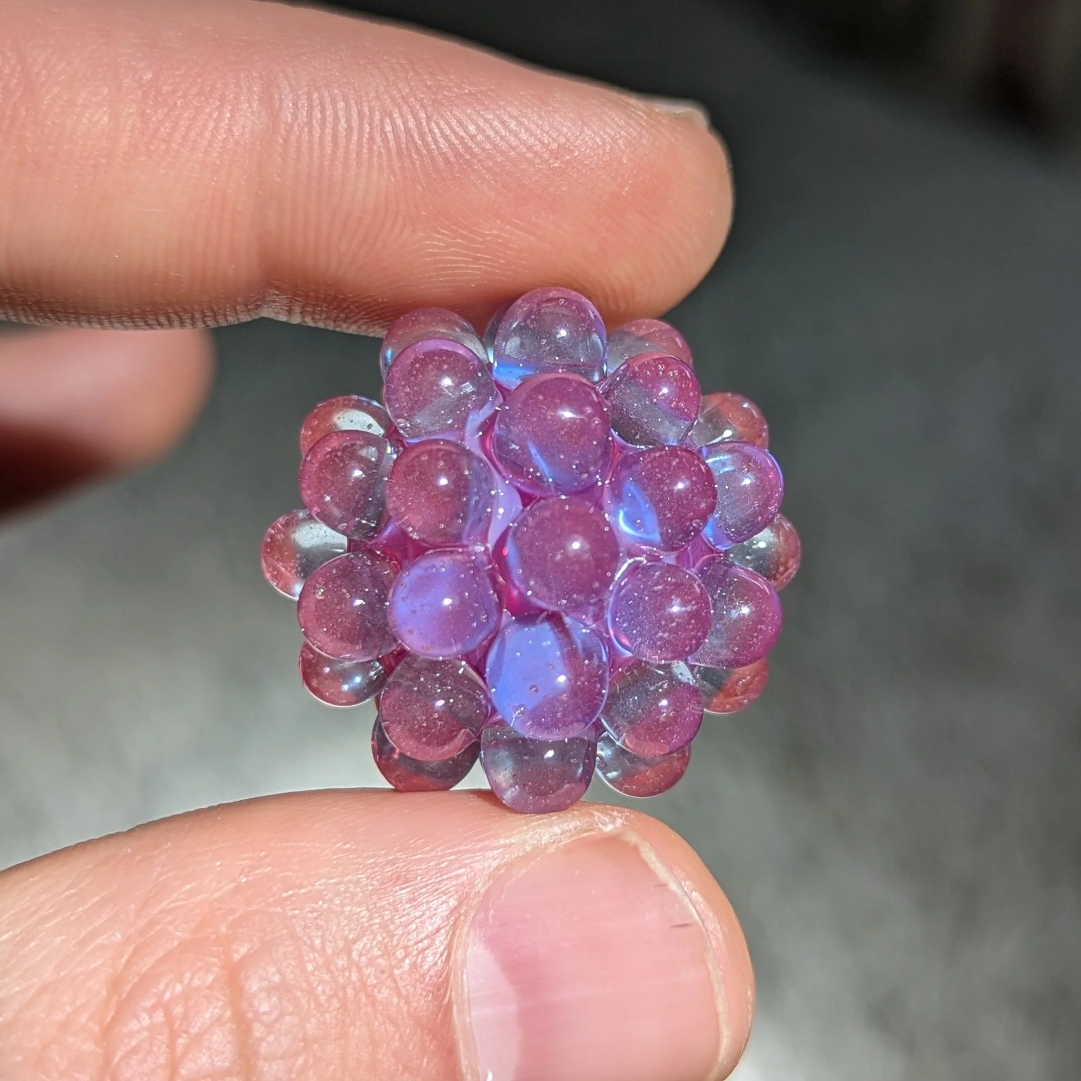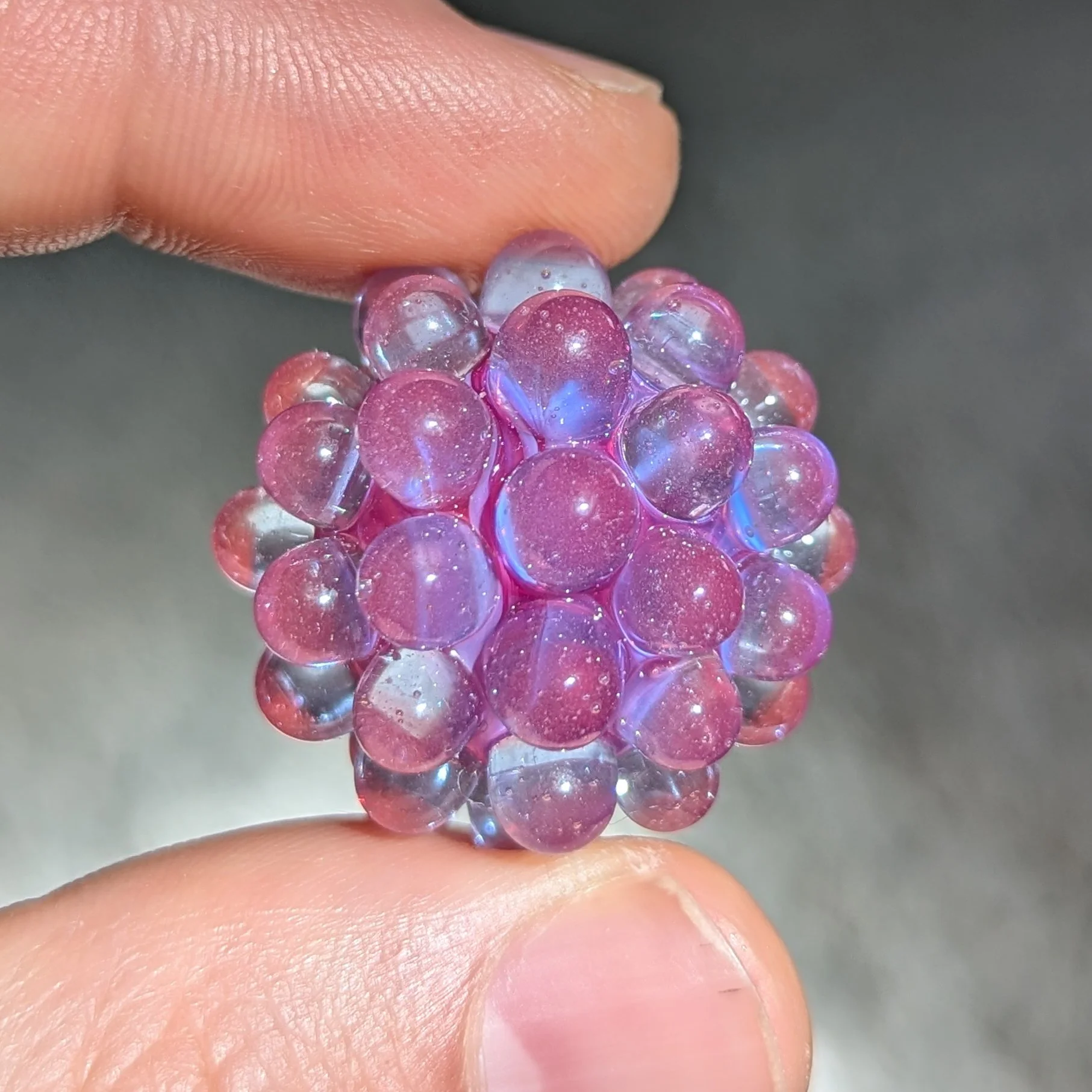 Magenta opal core. 44 transparent grey hobnails with red tips. The hobnails are made with hand mixed shades making this one unique