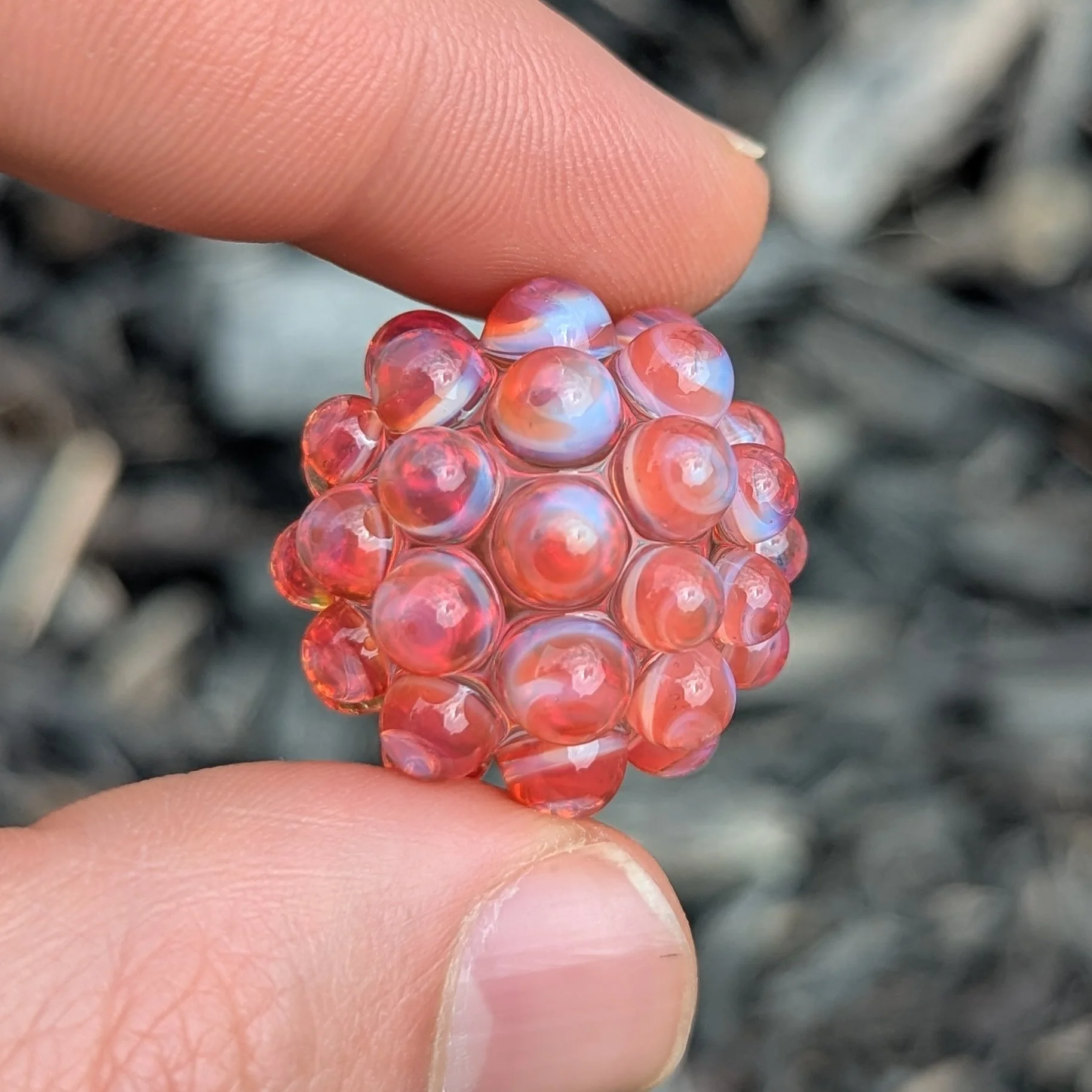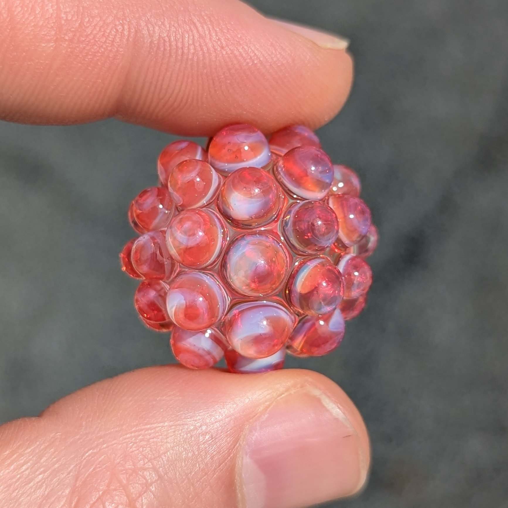 Clear core with 44 red and white swirl hobnails. This one looks like the filling in a cherry desert. Please don't eat tho.