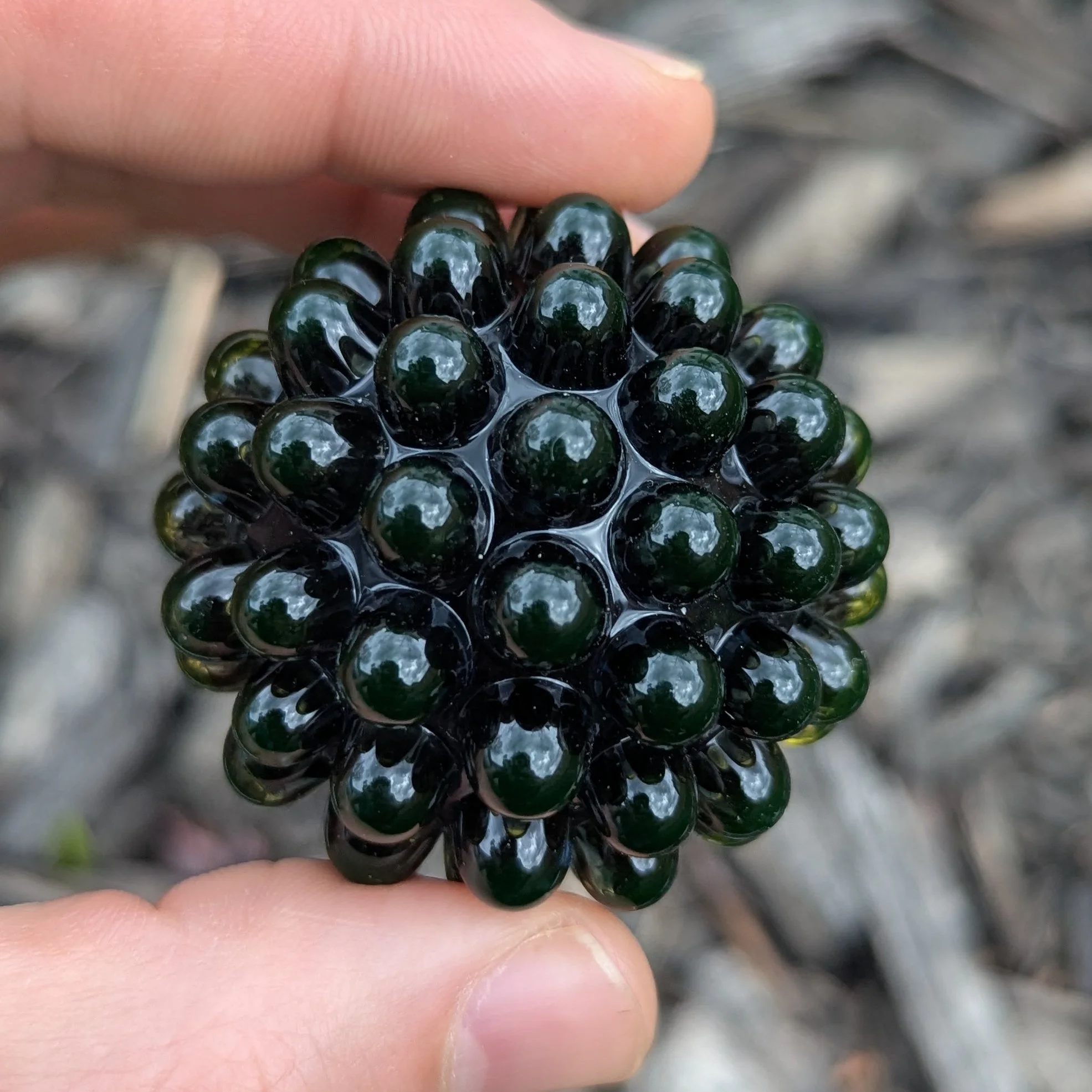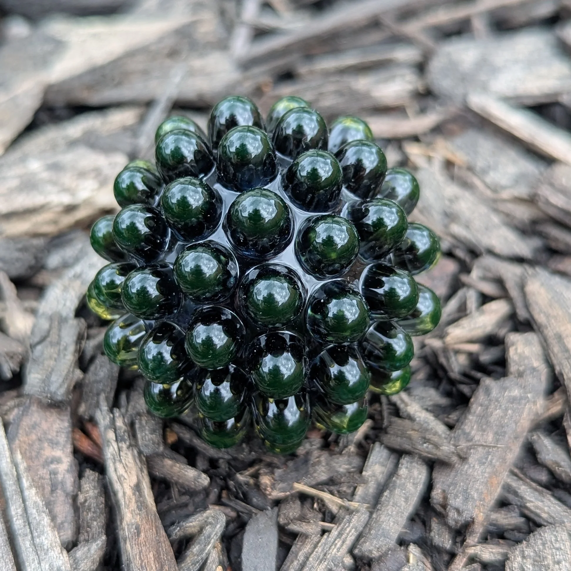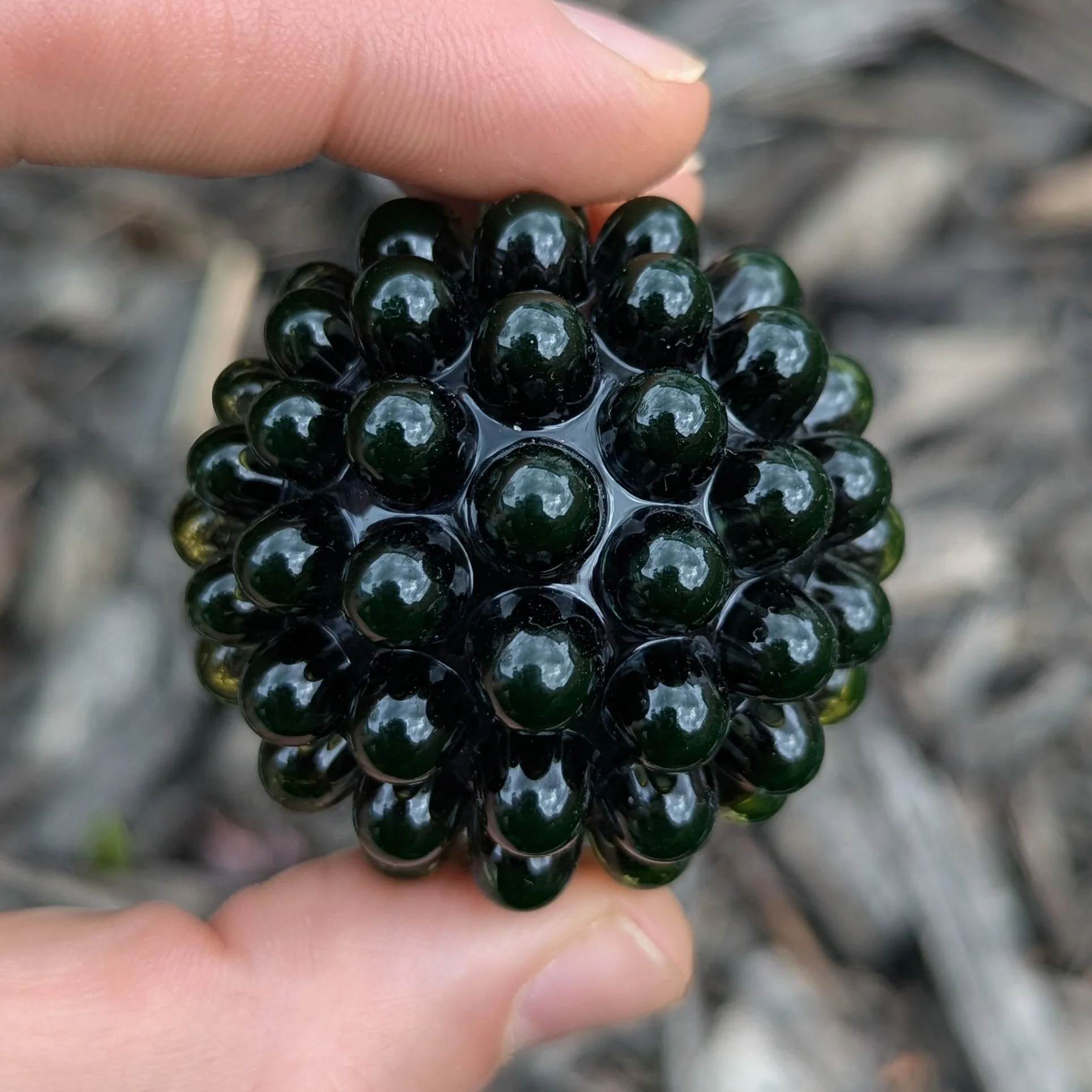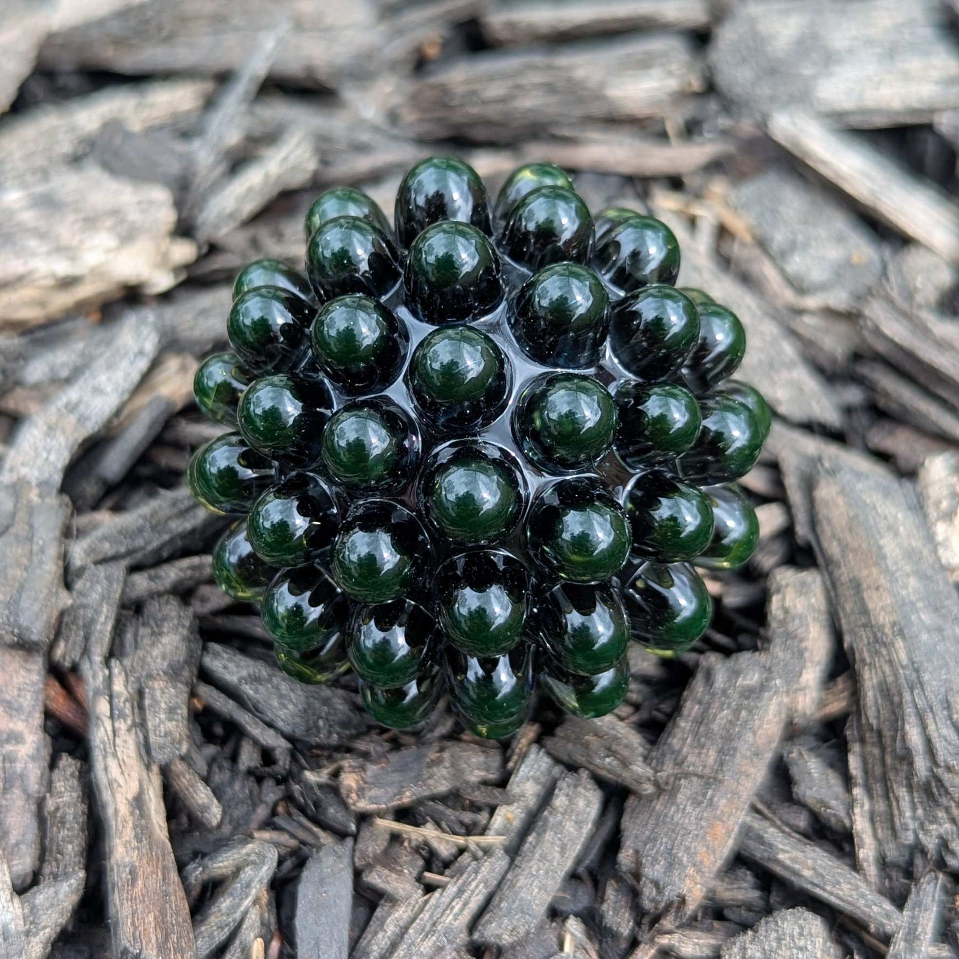 Large dark transparent blue core with 78 transparent black hobnails layer with. Green UV reactive glass.