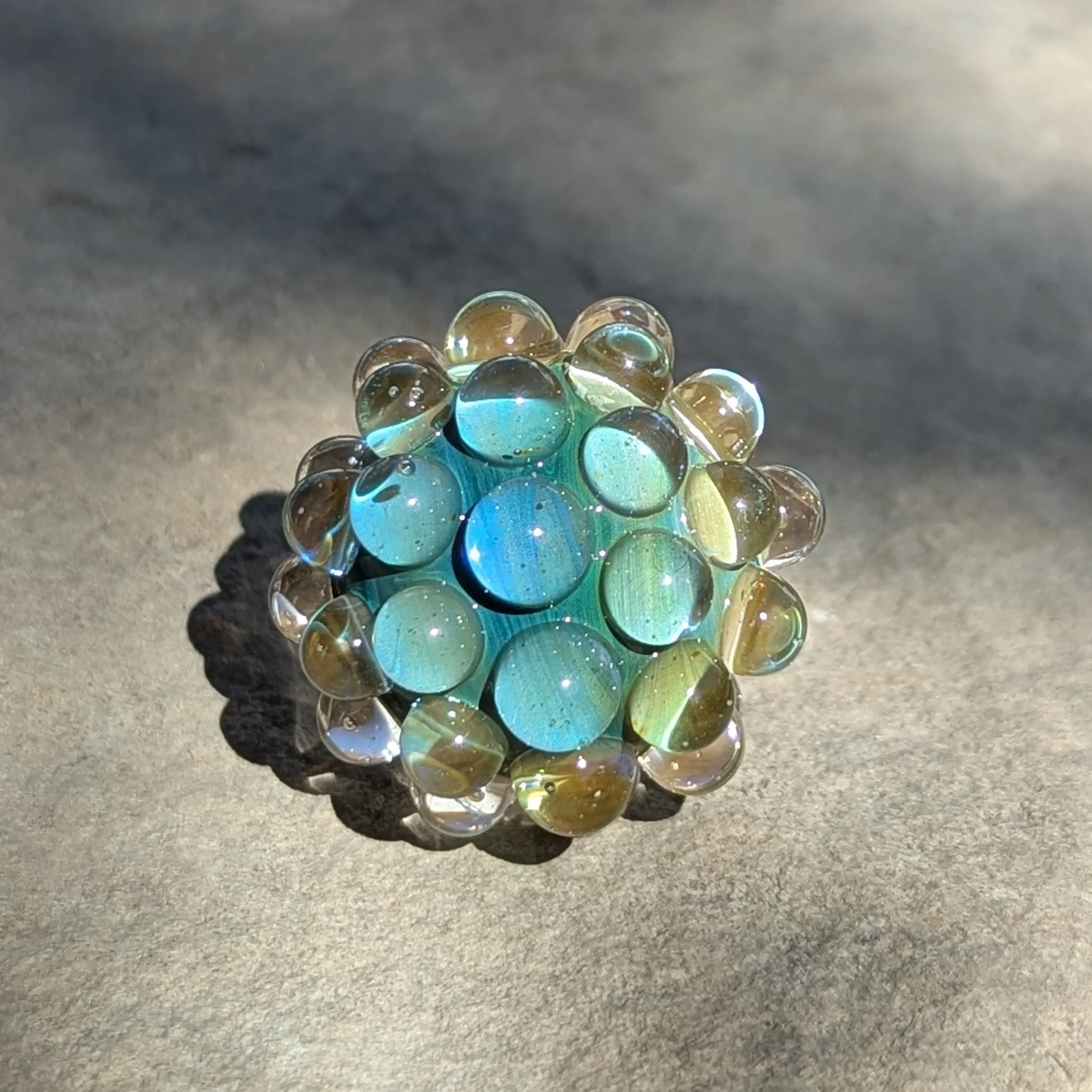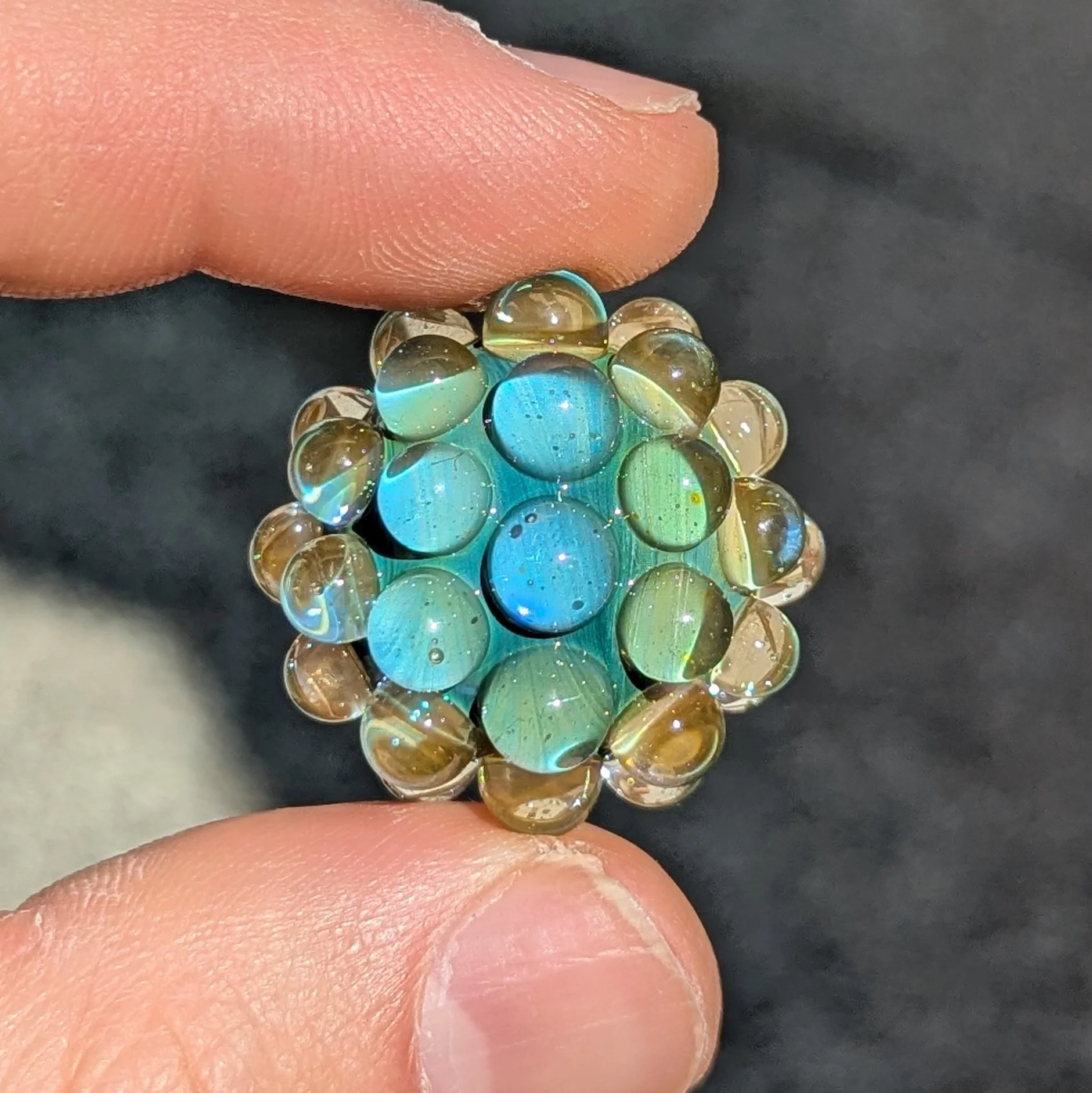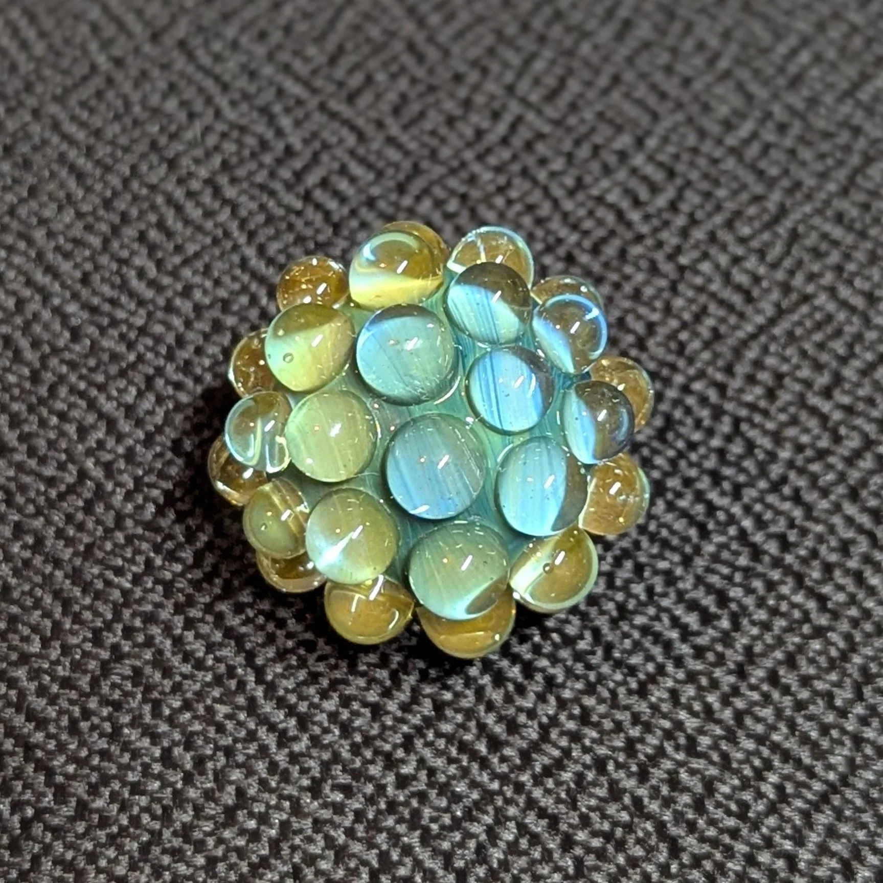 Silver fumed core with 44 transparent yellow hobnails. I included photos with different lighting scenarios.