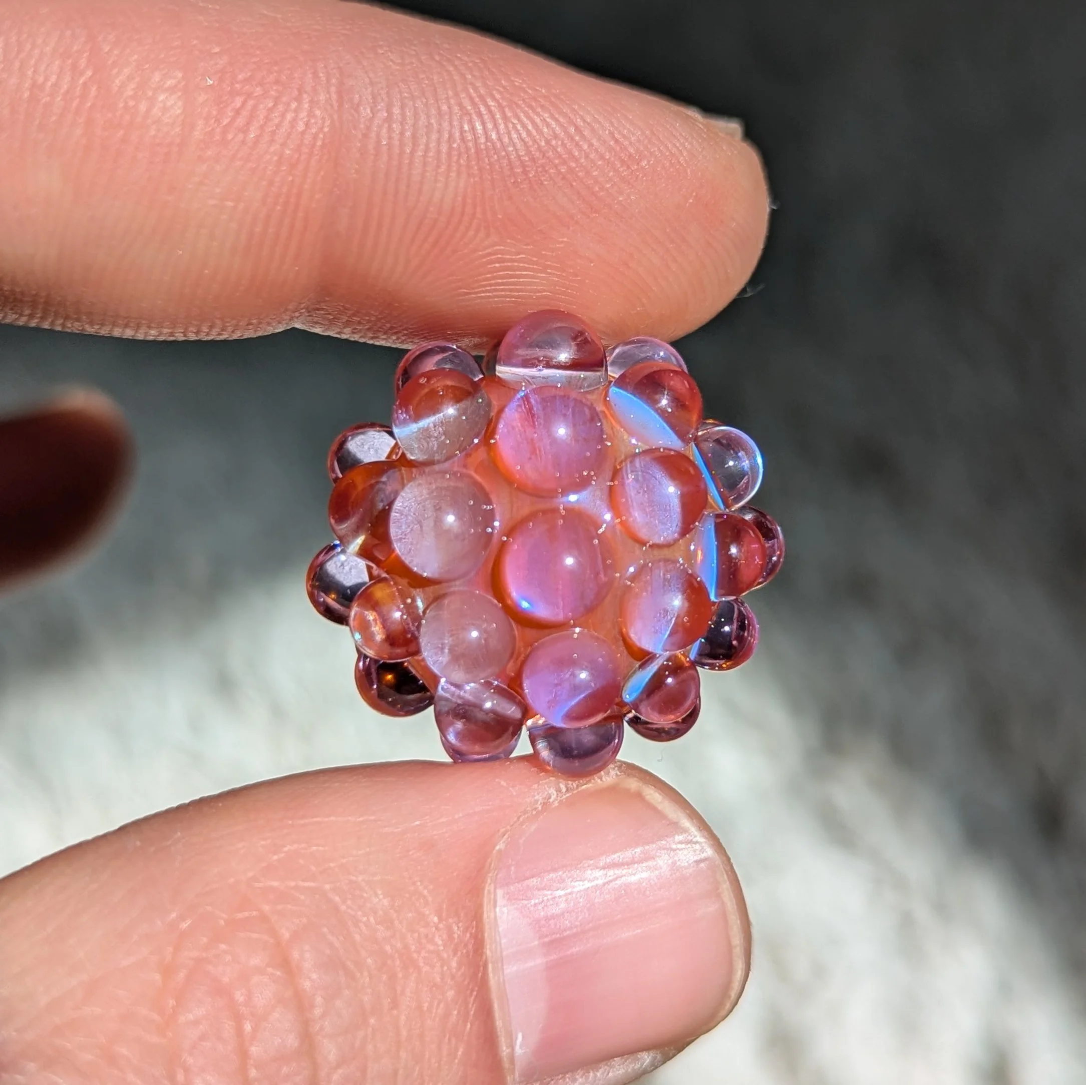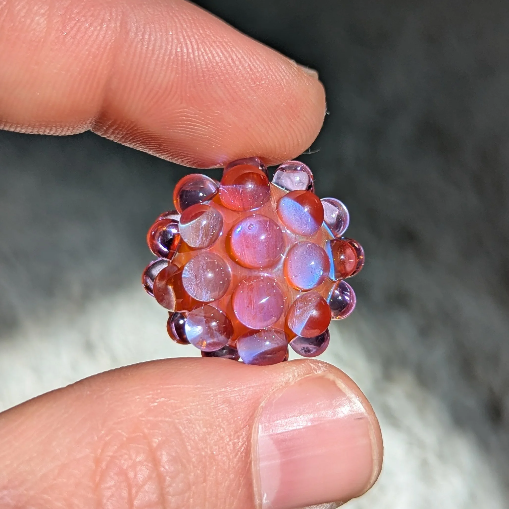 Small orange core with silver fume and 44 transparent purple hobnails. The silver reflects blue tones that create interesting color interactions with the transparent orange core and purple hobnails. These small ones make great pocket pieces
