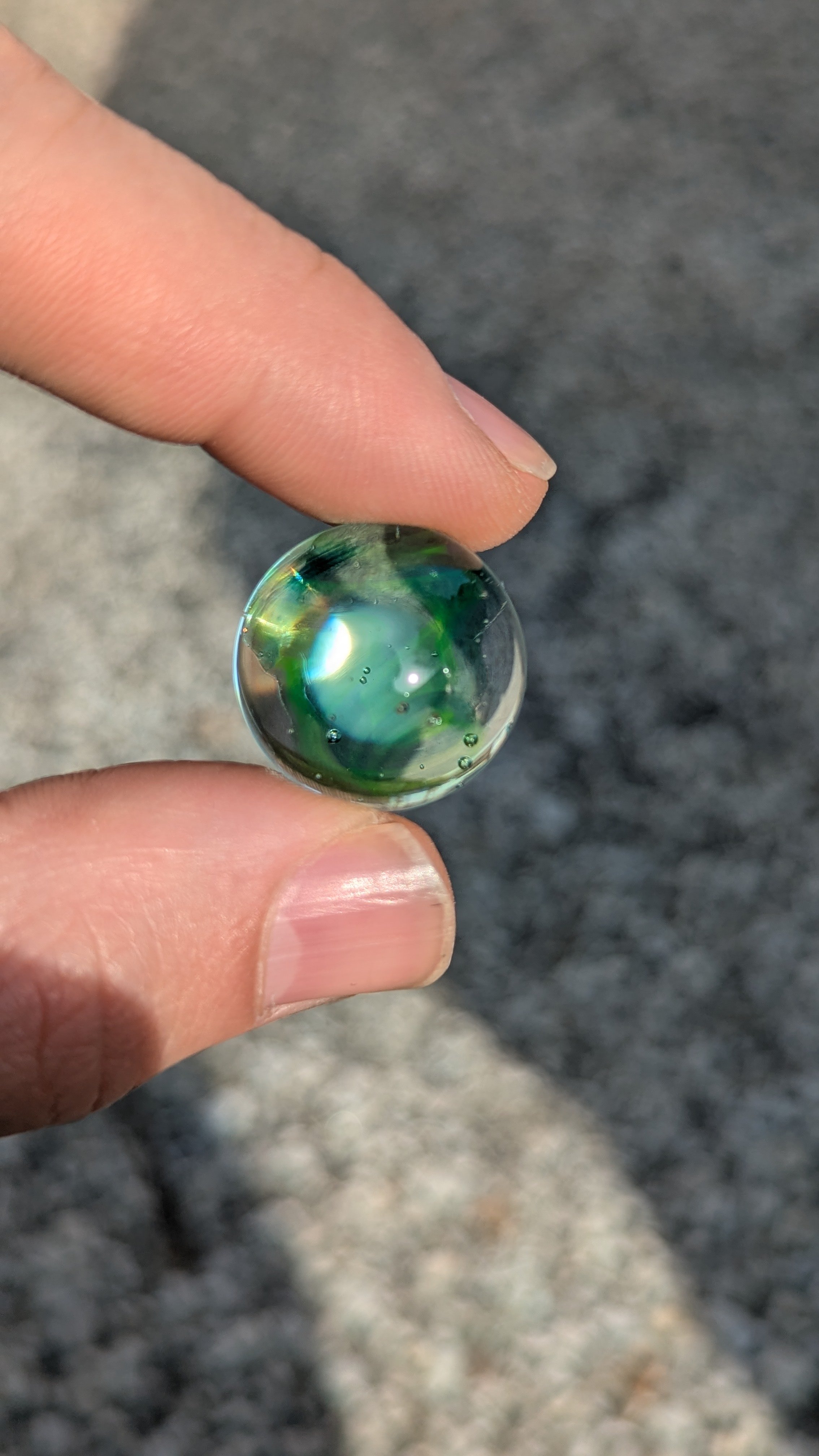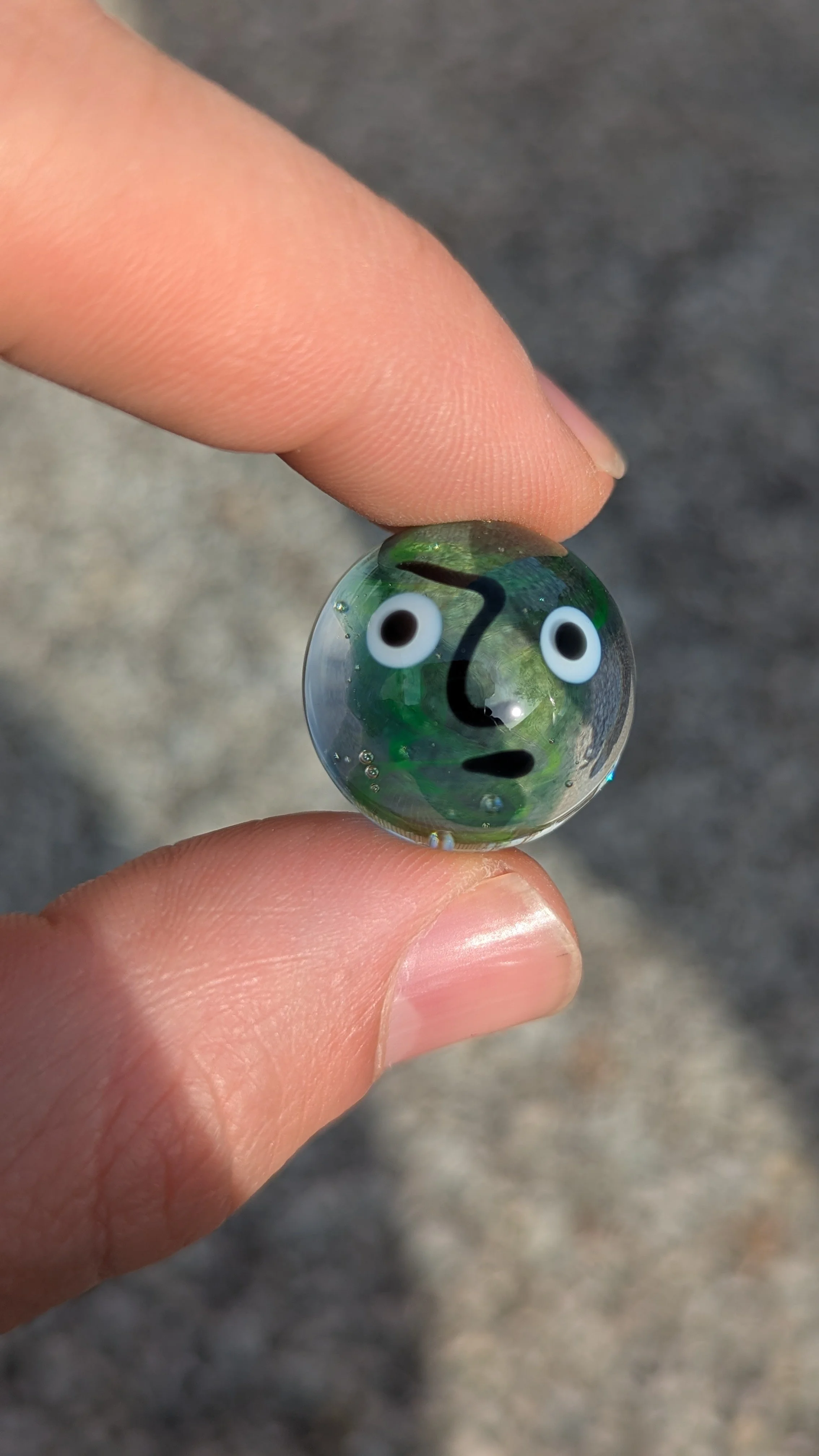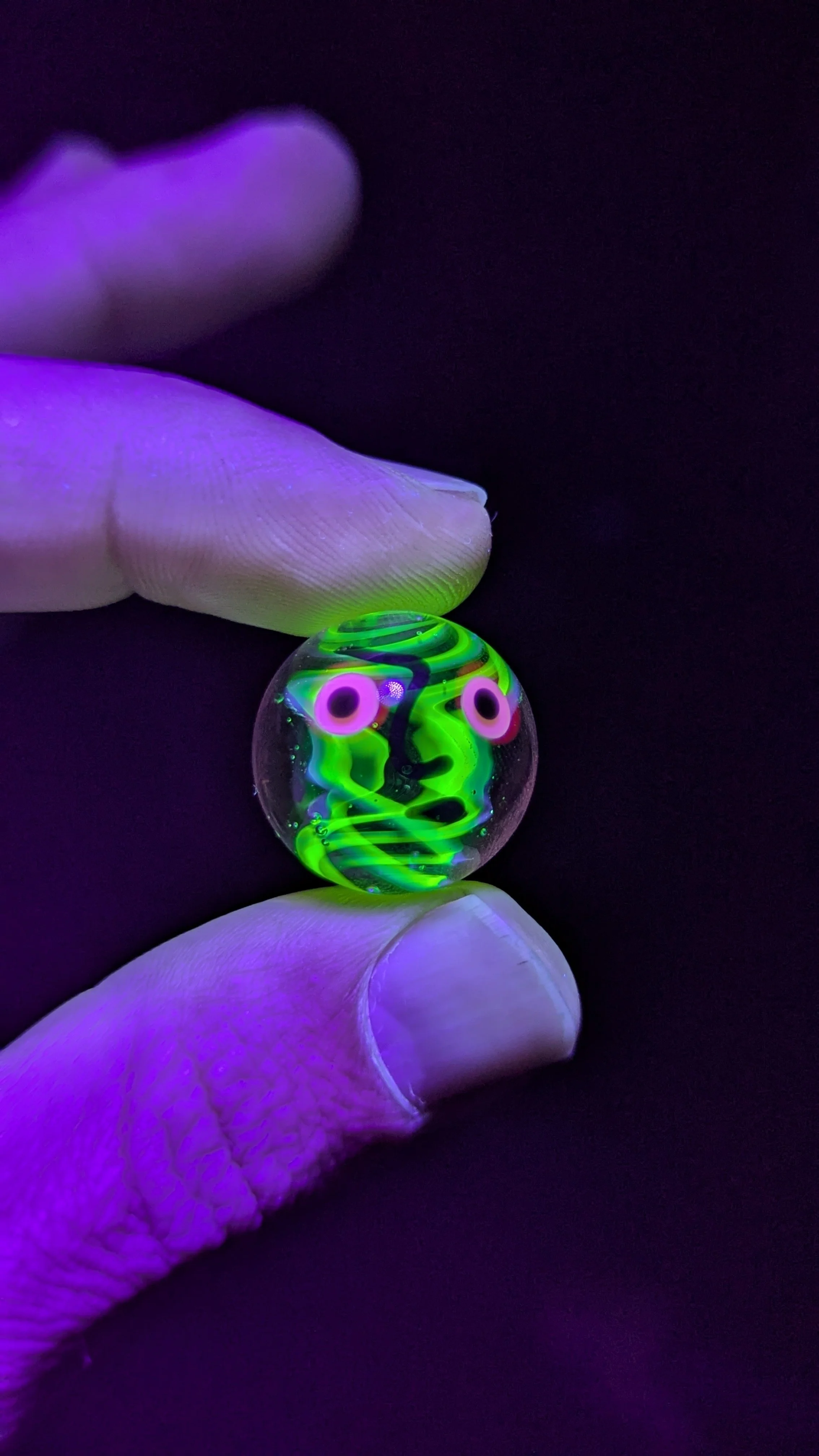 Emotions marble with a green UV swirl core, pink eyes, and a perturbed looks