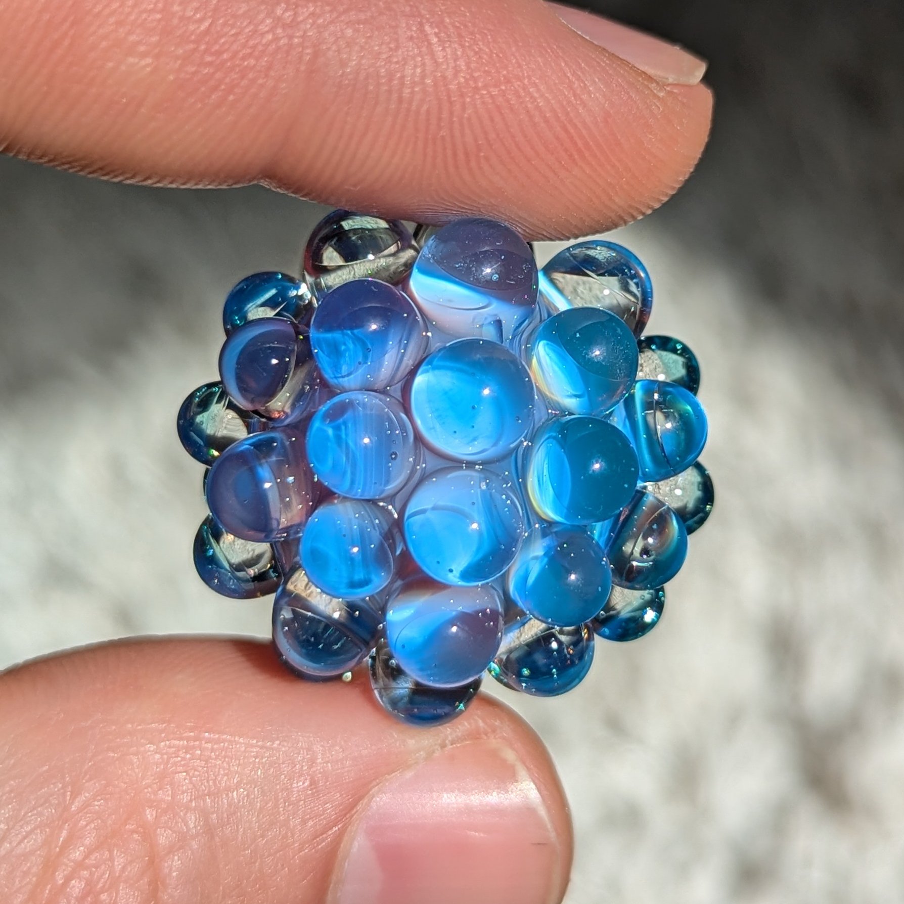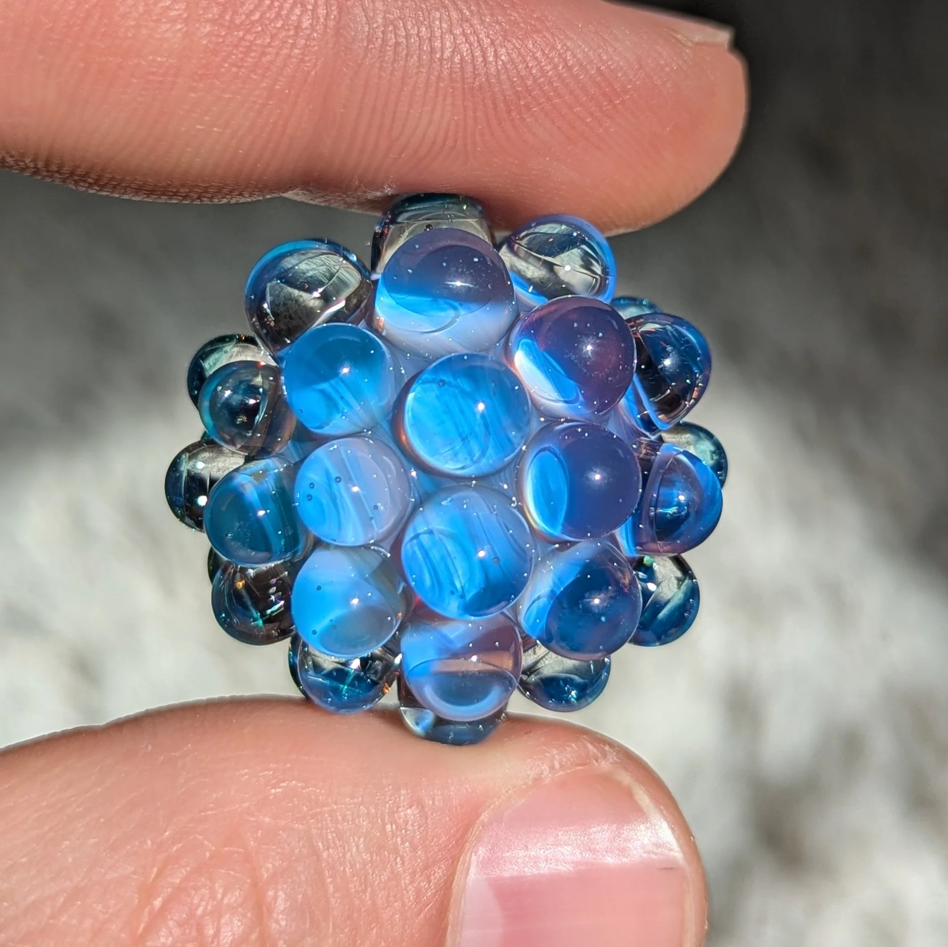 Blue and purple opal core. 44 clear hobnails with copper blue tips.