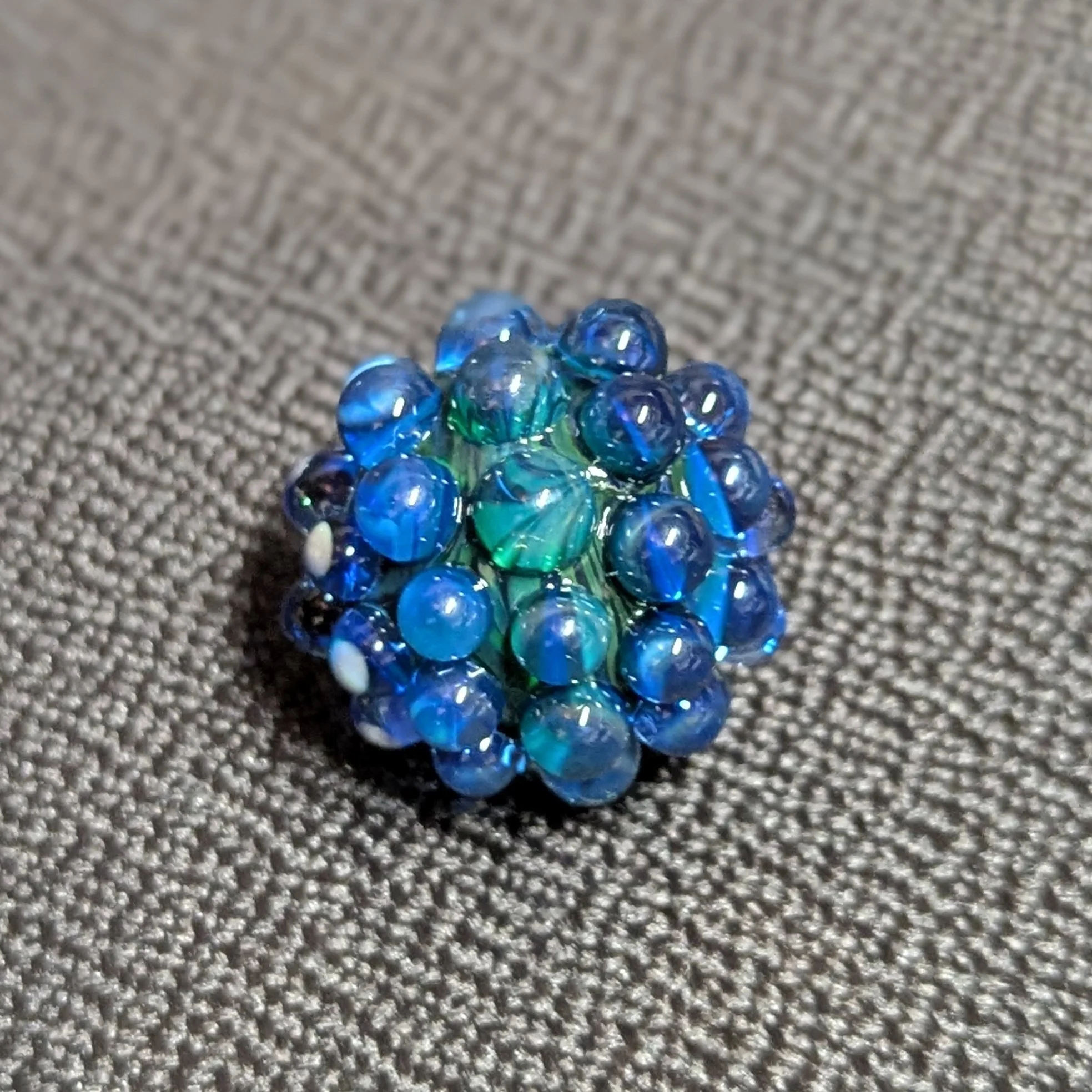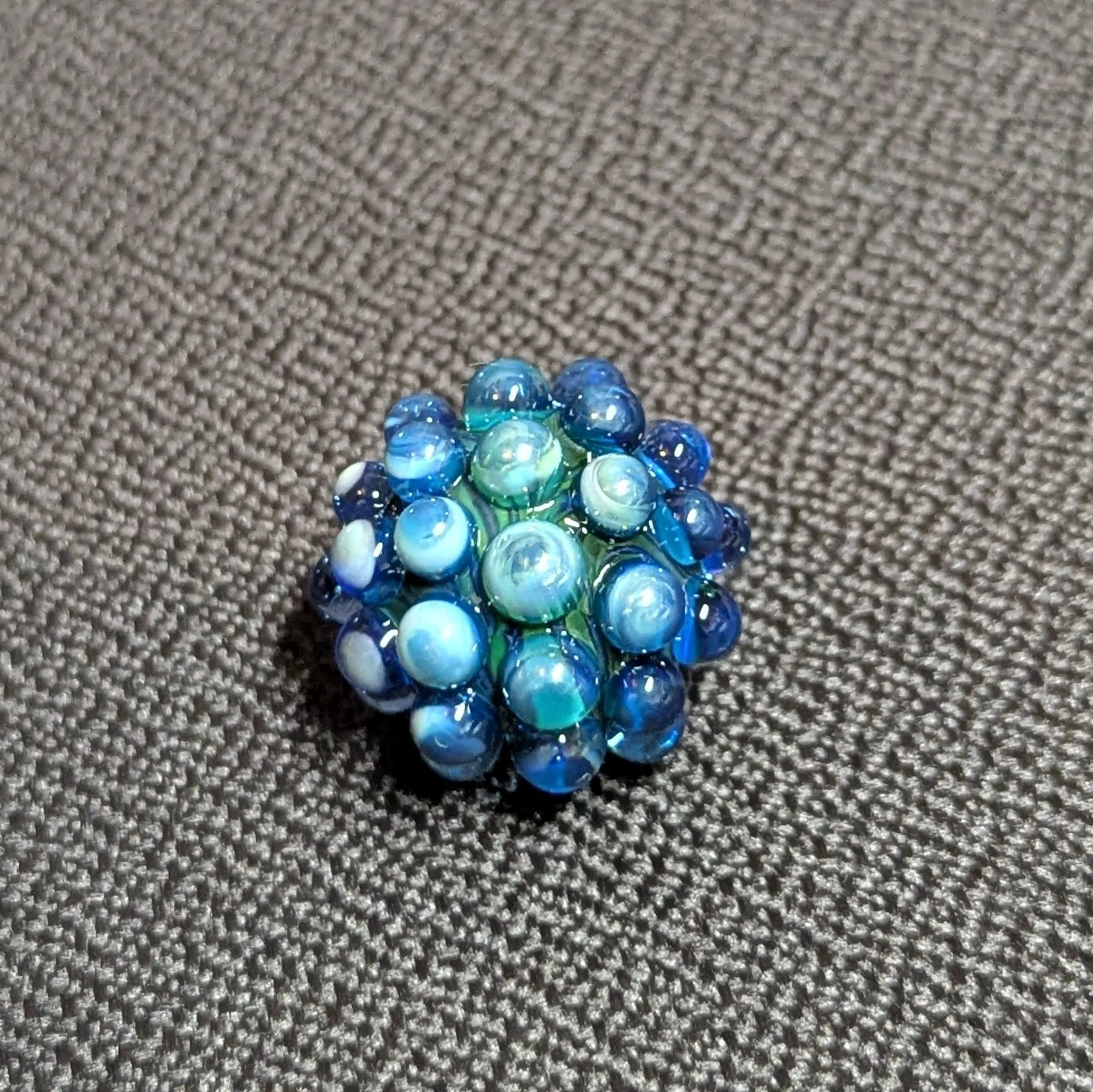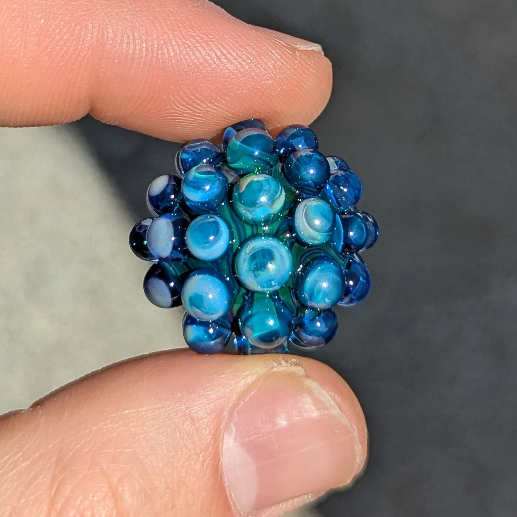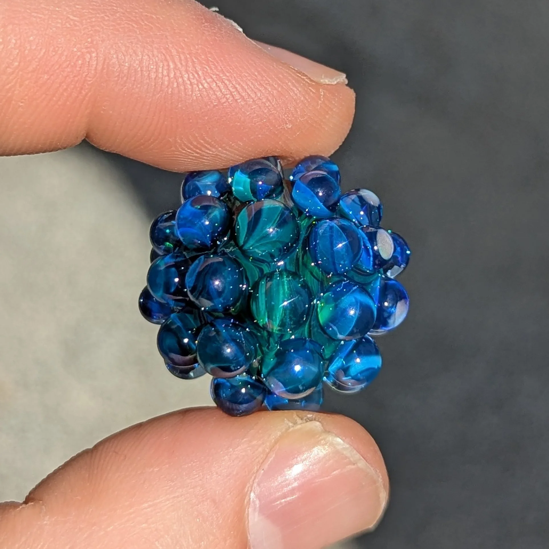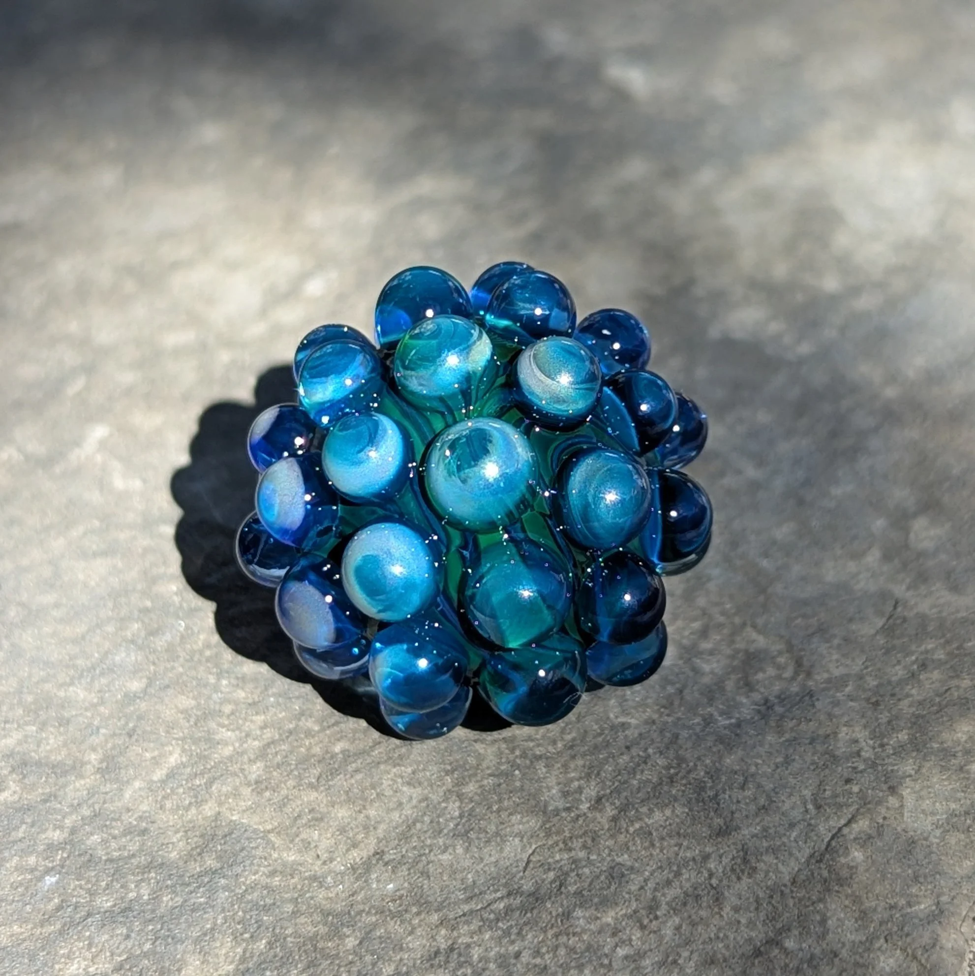 Pocket size dark blue green swirl core with 44 cobalt blue hobnails. There is a silver fume coating on about half of the piece. Light green UV accents. I included photos with different lighting scenarios.