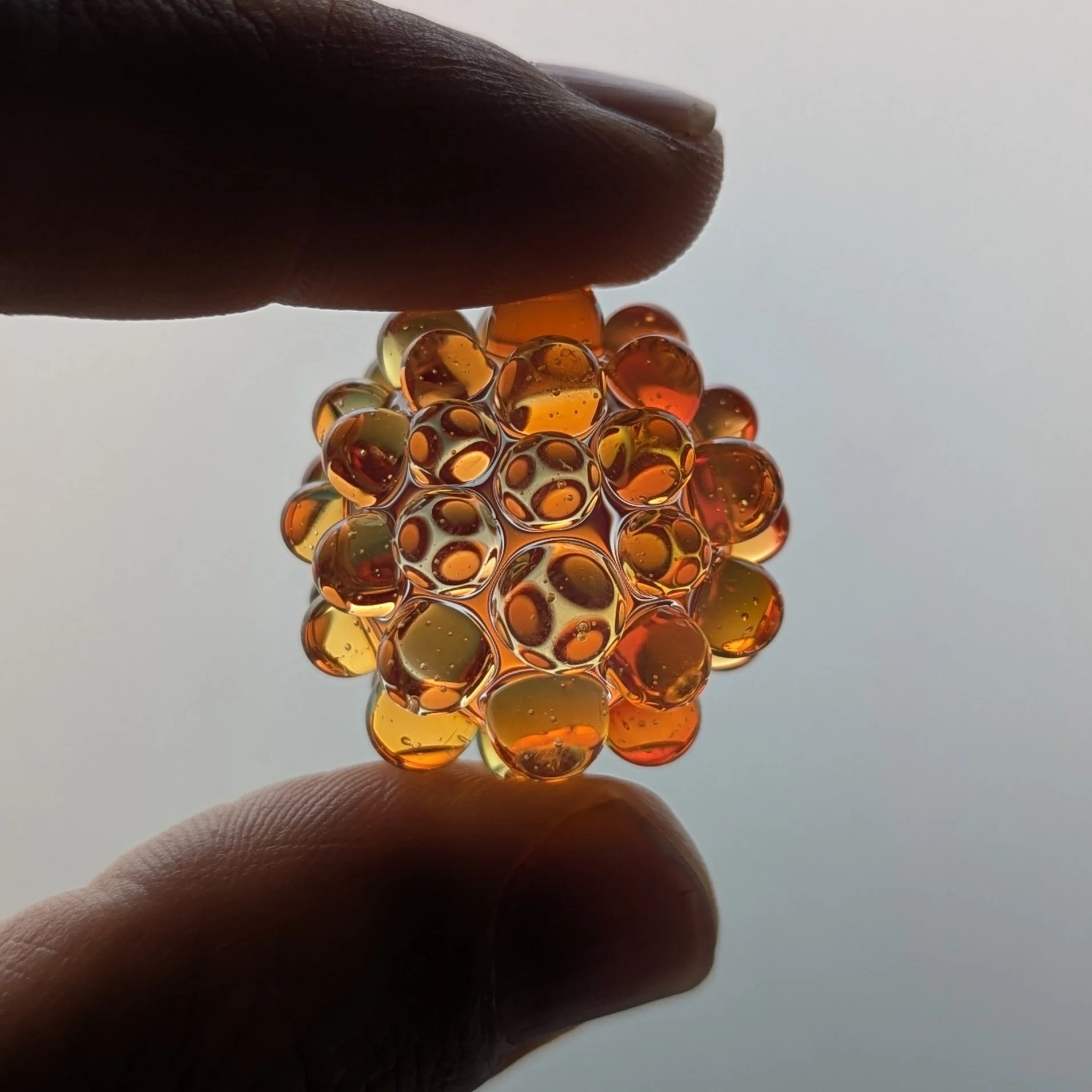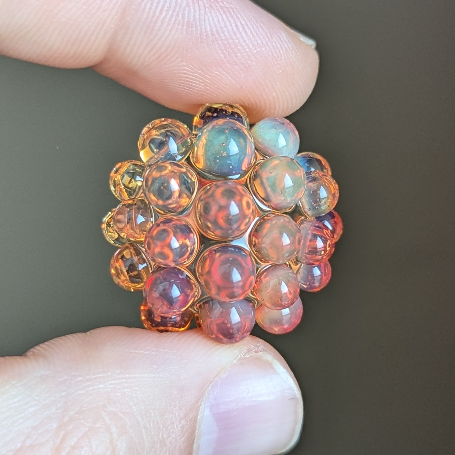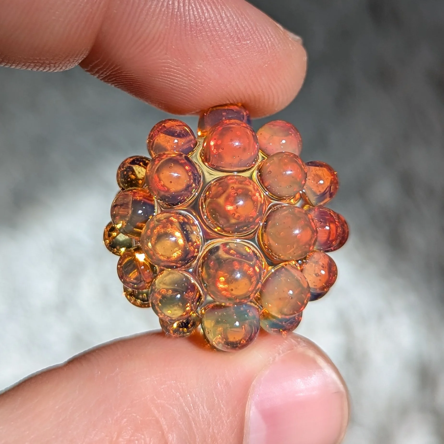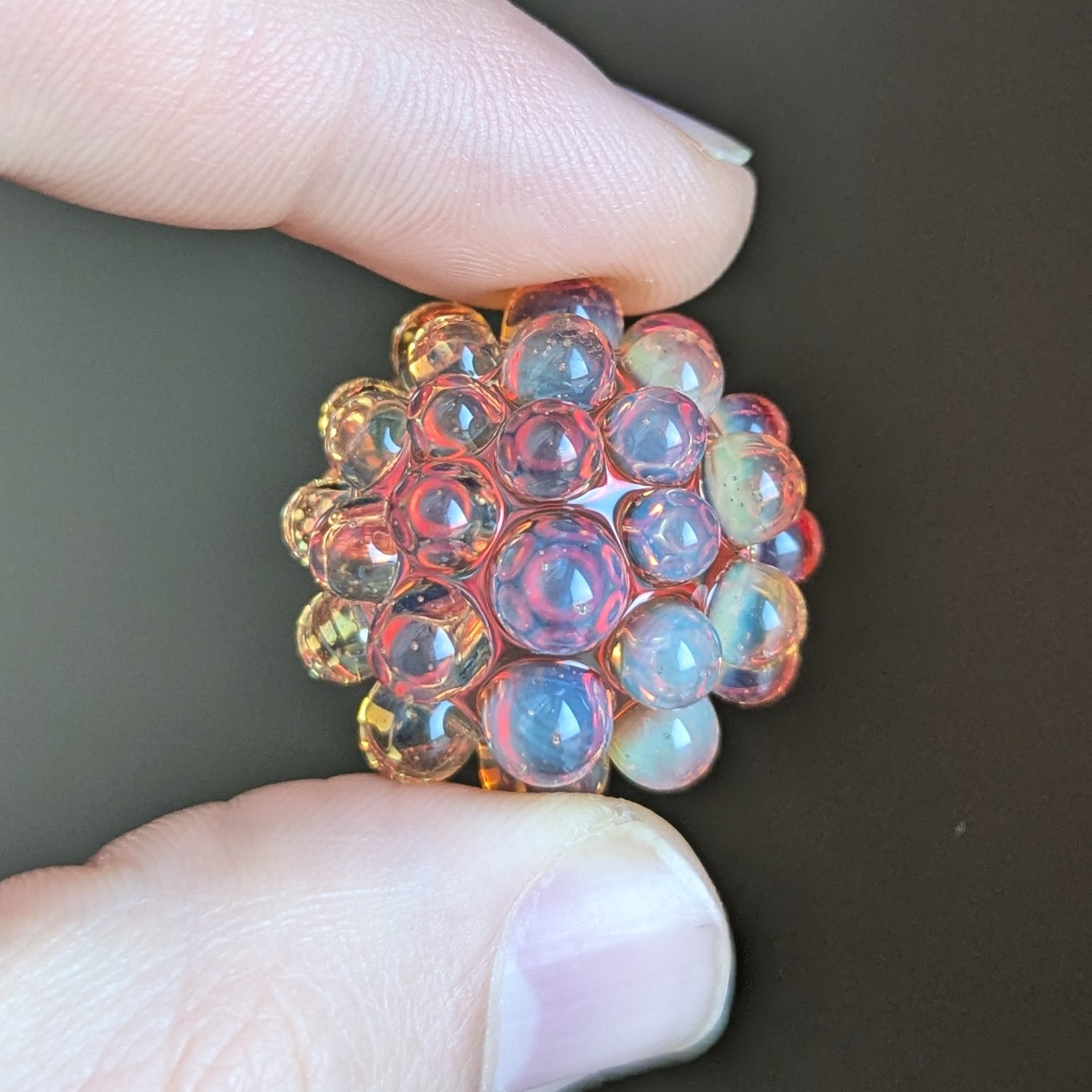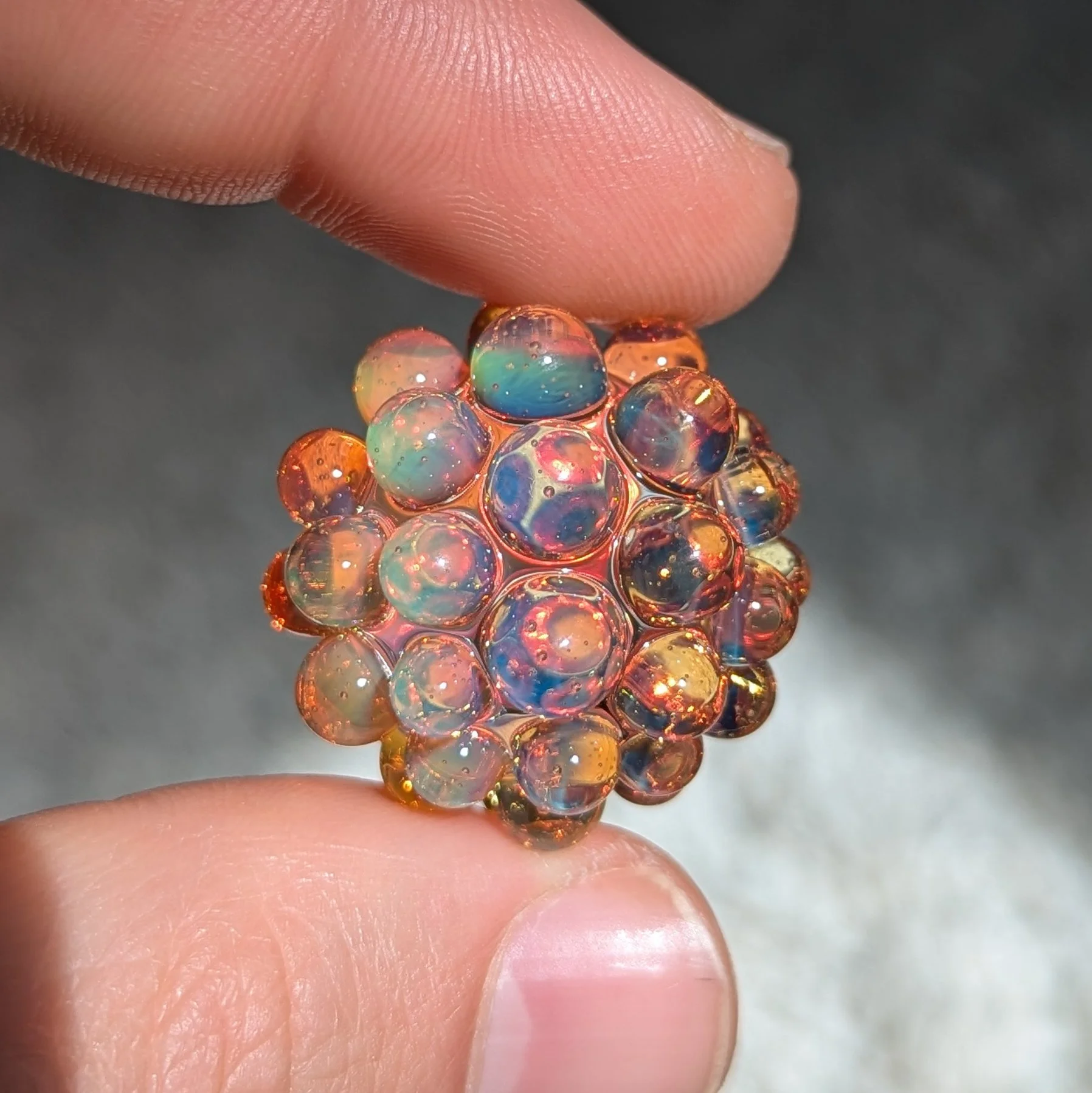 Clear core with 44 striking yellow/orange/ blue color hobnails. I absolutely love the way this one looks in the sun. These striking colors can appear different depending on the quality and intensity of light so I included a bunch of different photos to give you a sense of that.