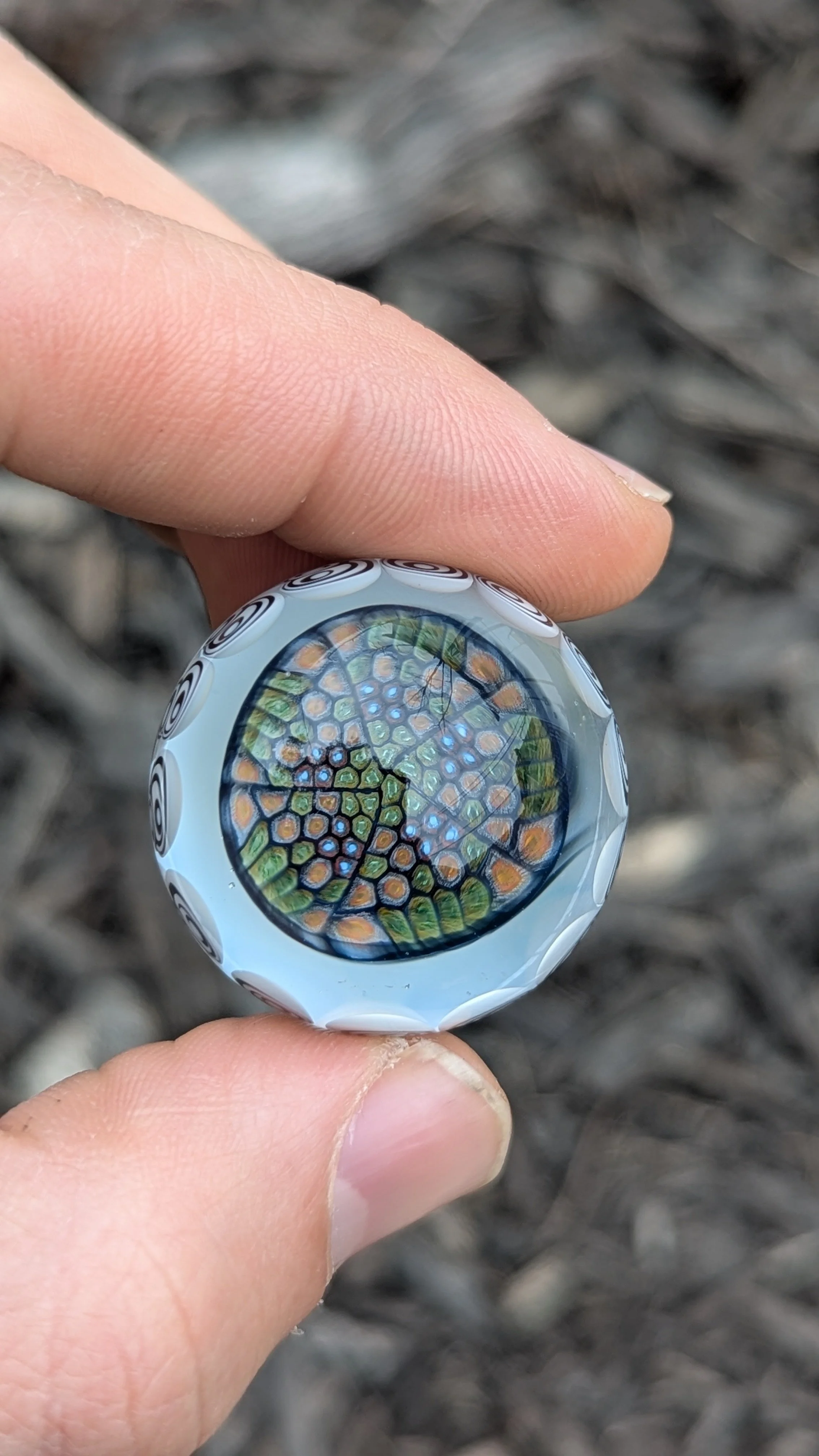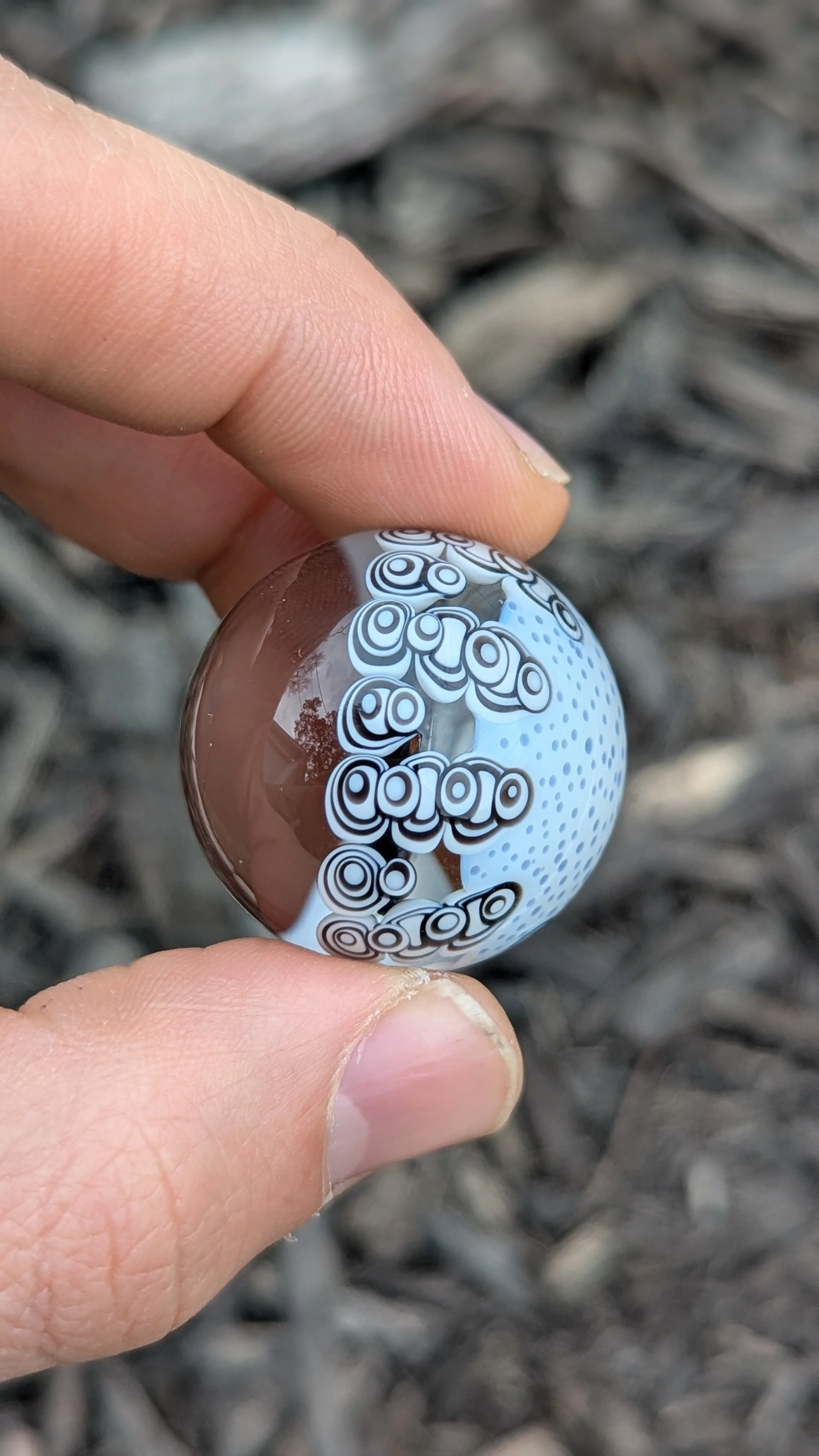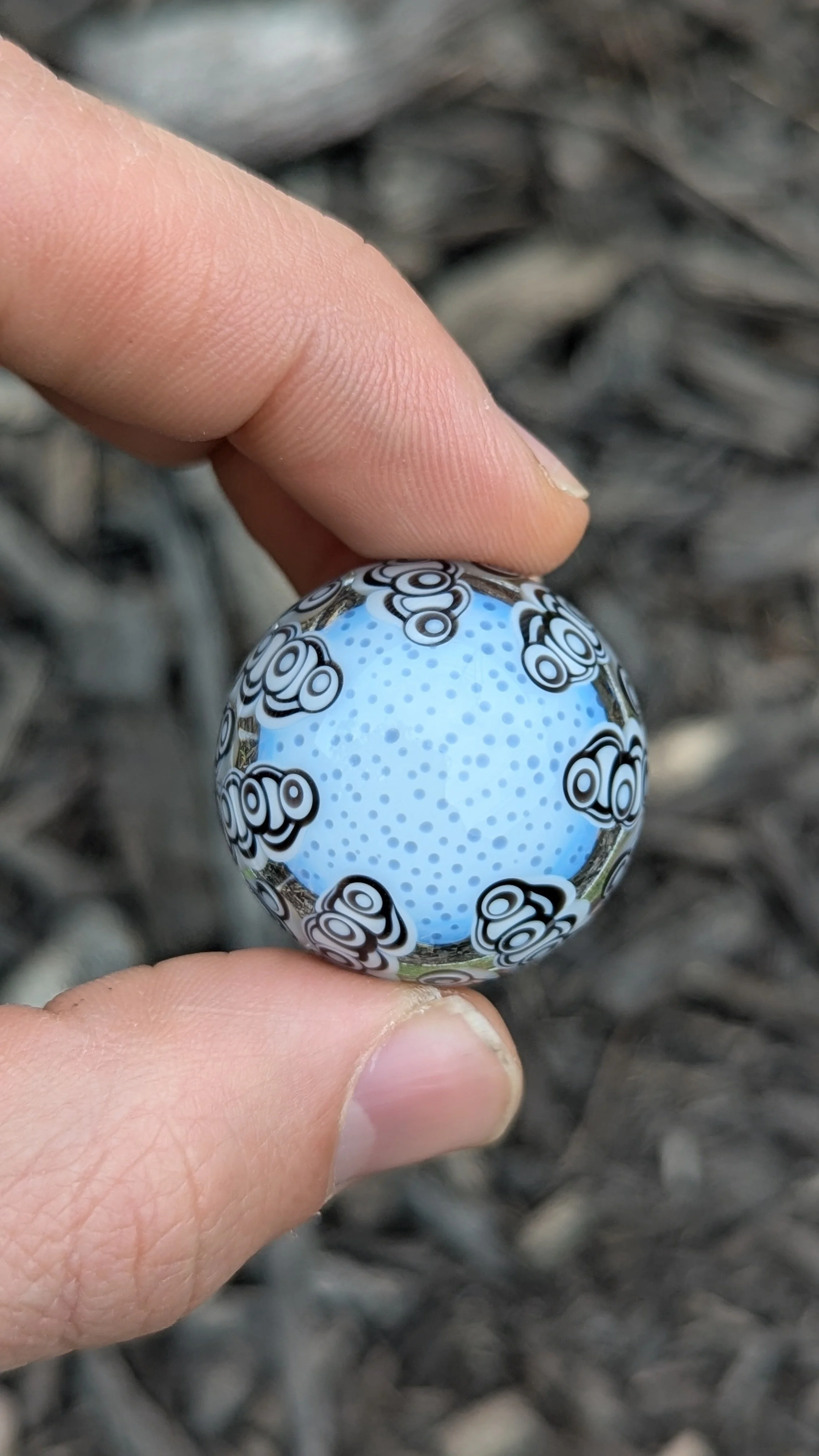 Cellular milli pattern with a black, white, and blue dot pattern on the sides and back.