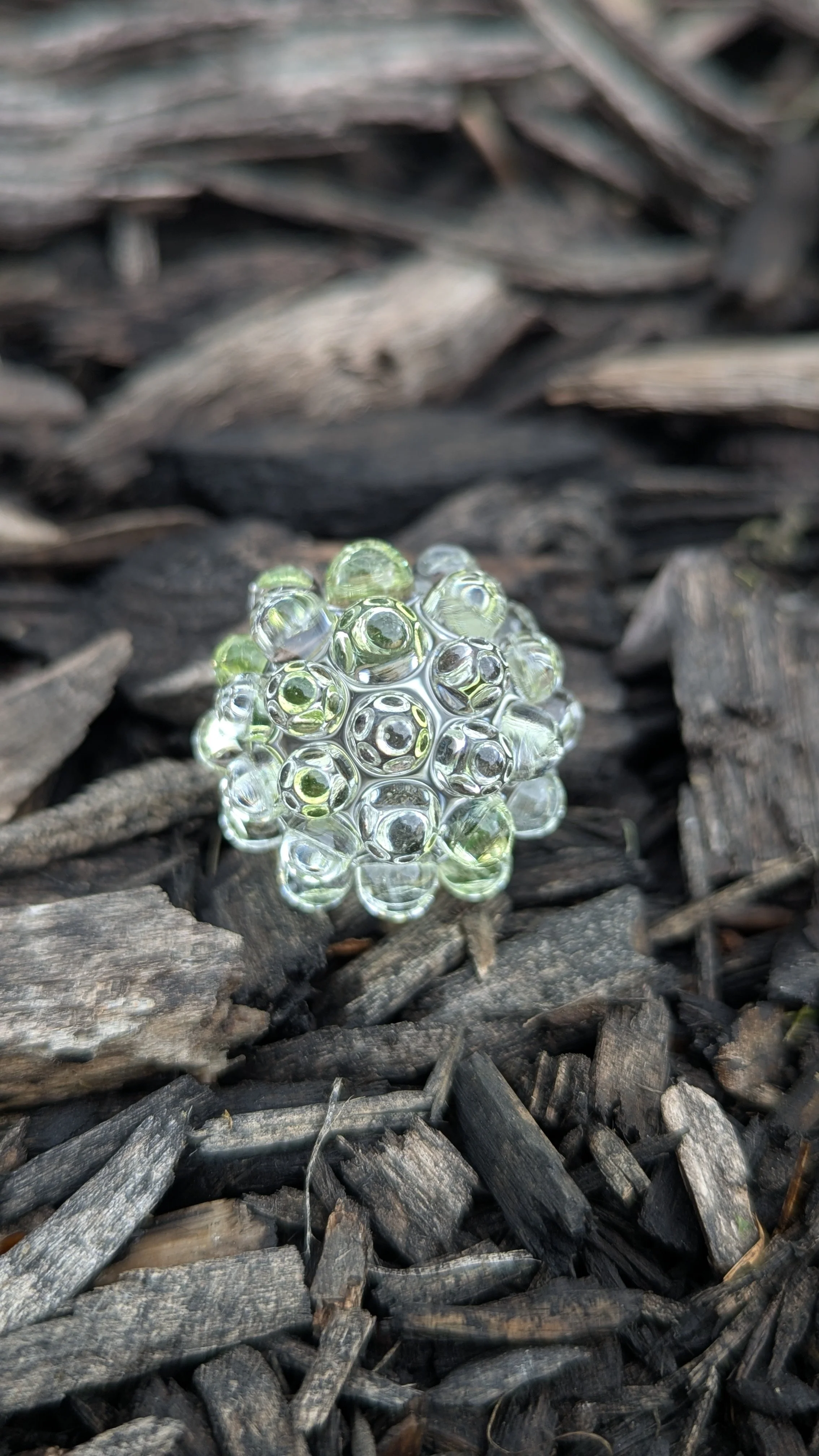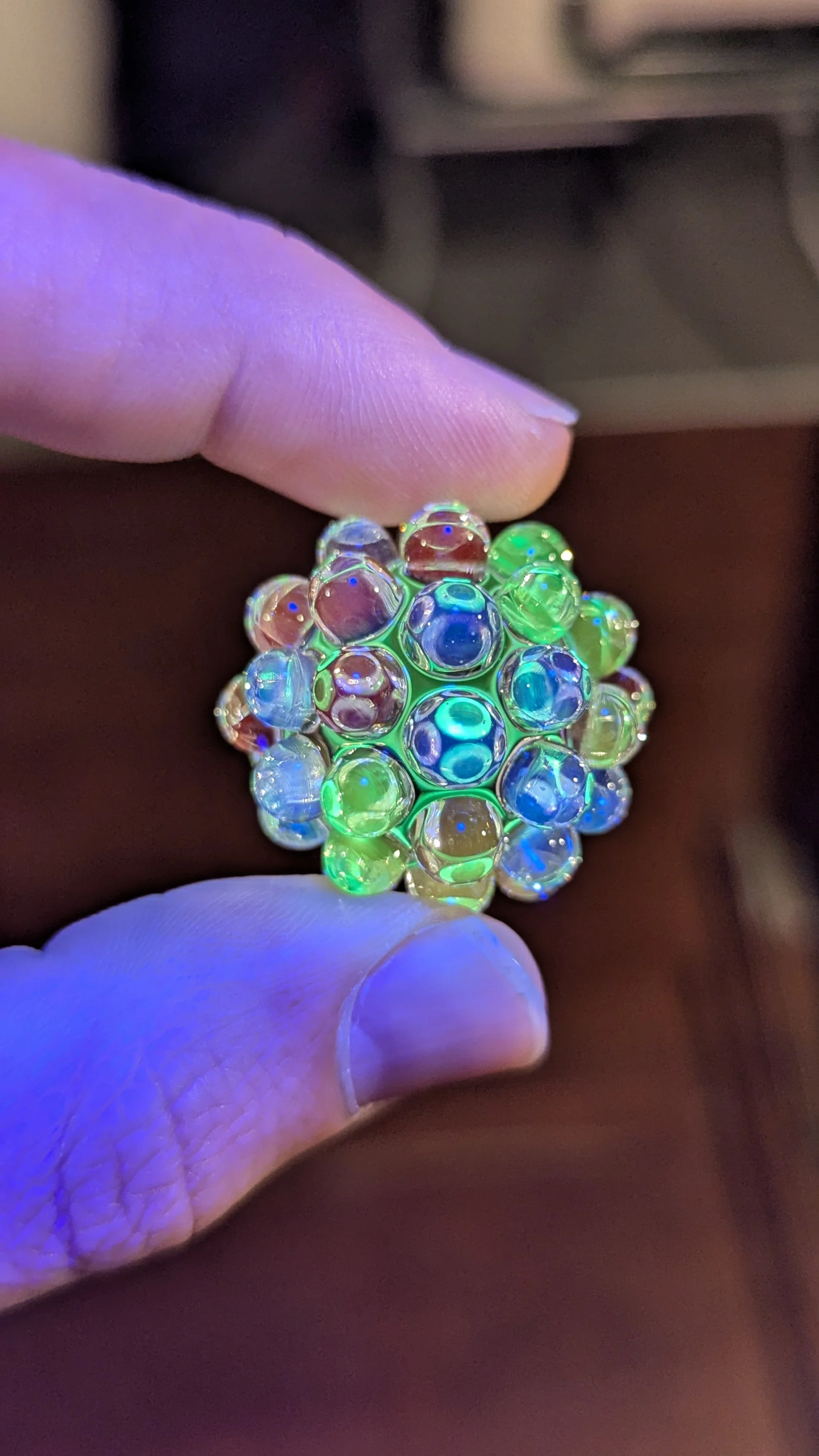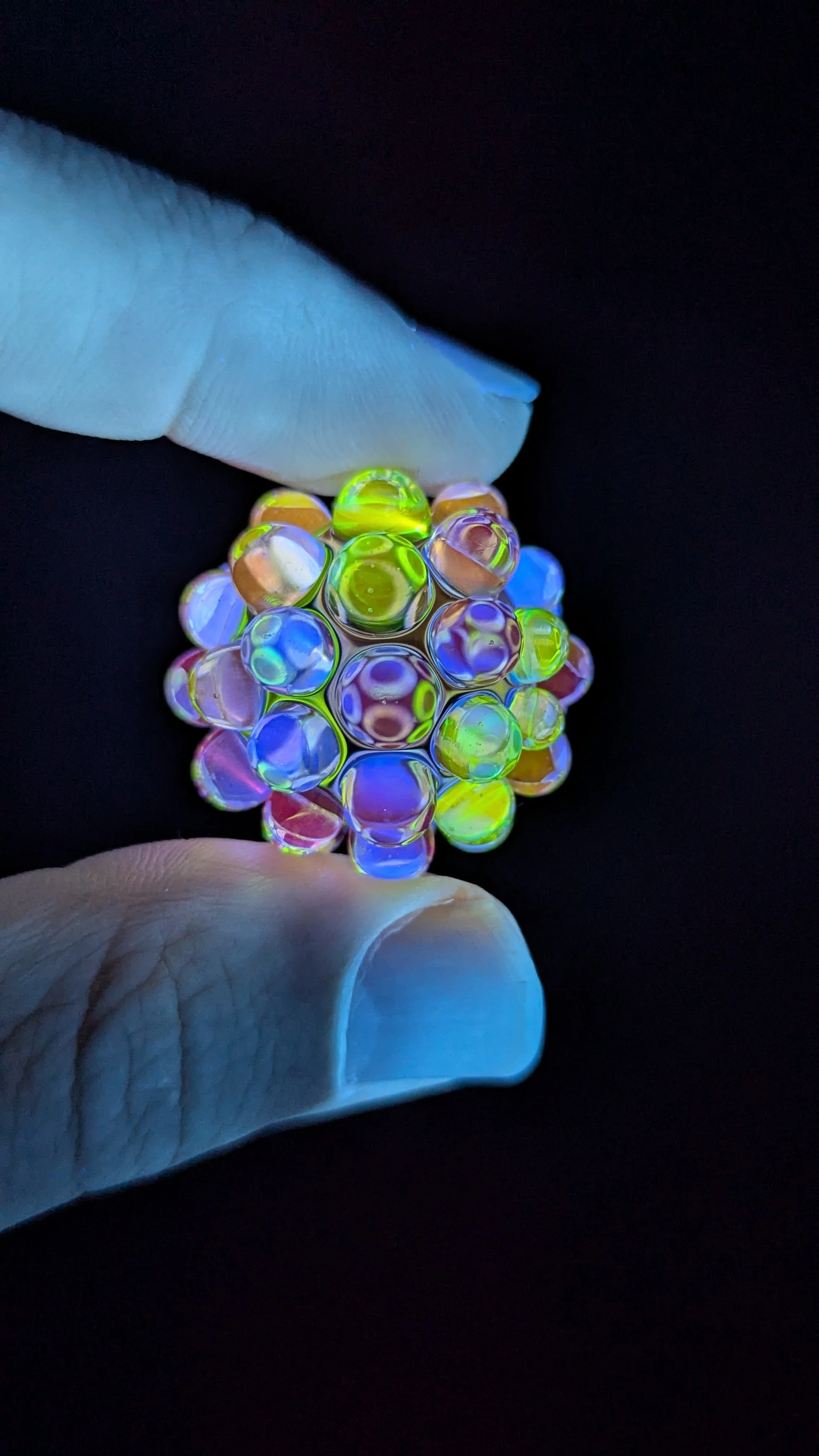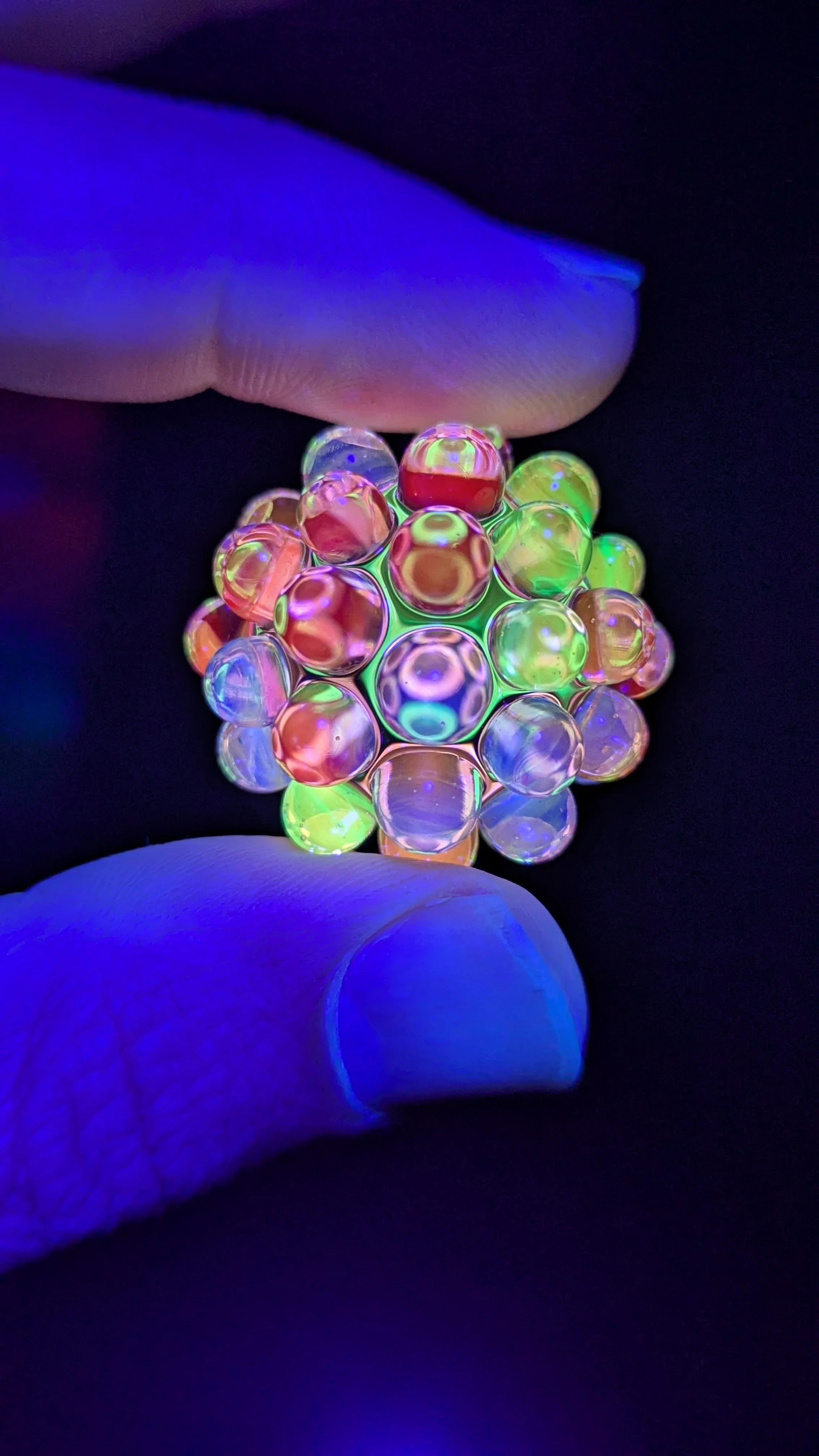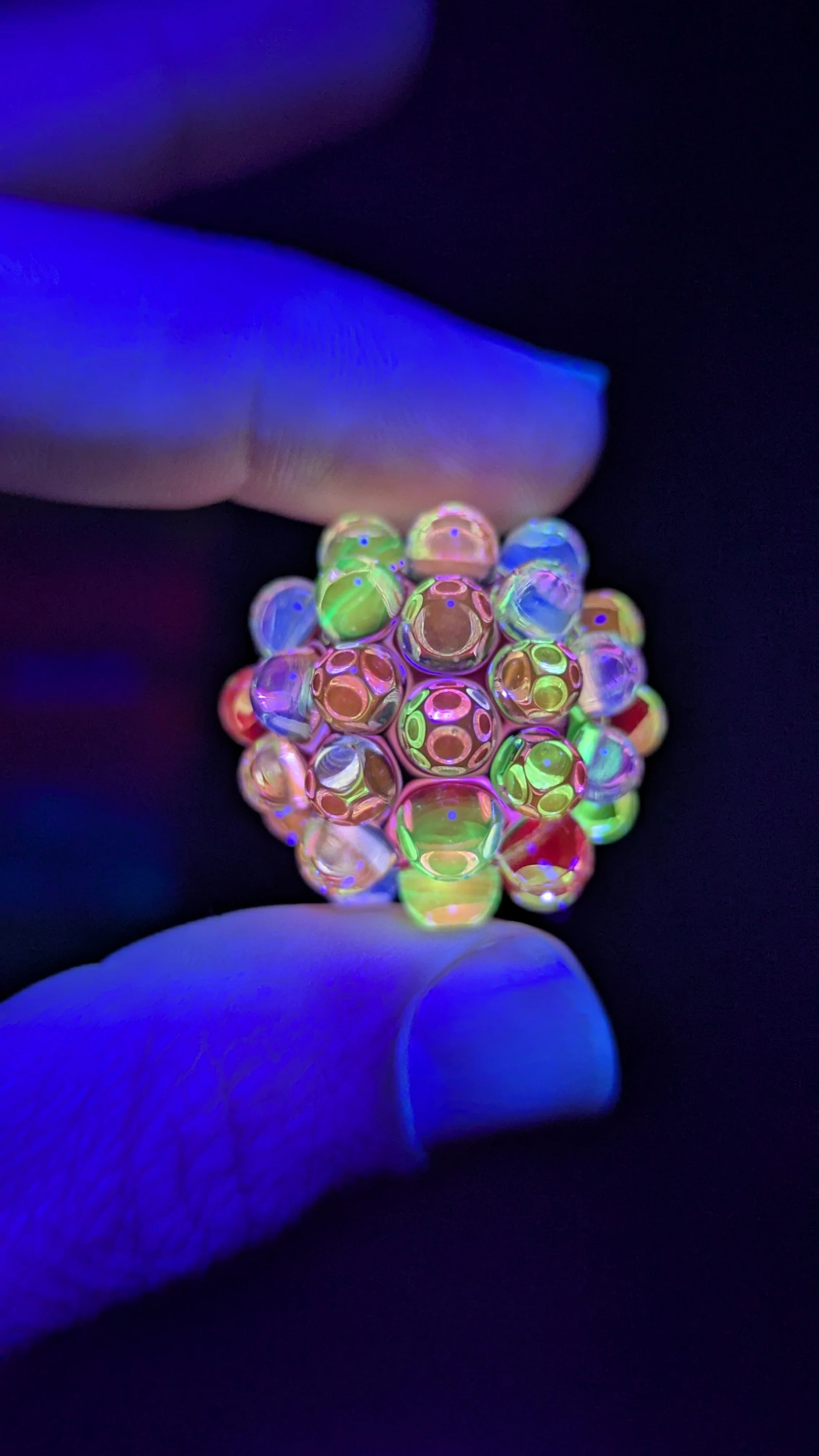 Multicolor UV core with 44 mostly clear hobnails. I used some hand mixed UV colors to create some unique shades. I included photos with both 365nm and 395nm UV light