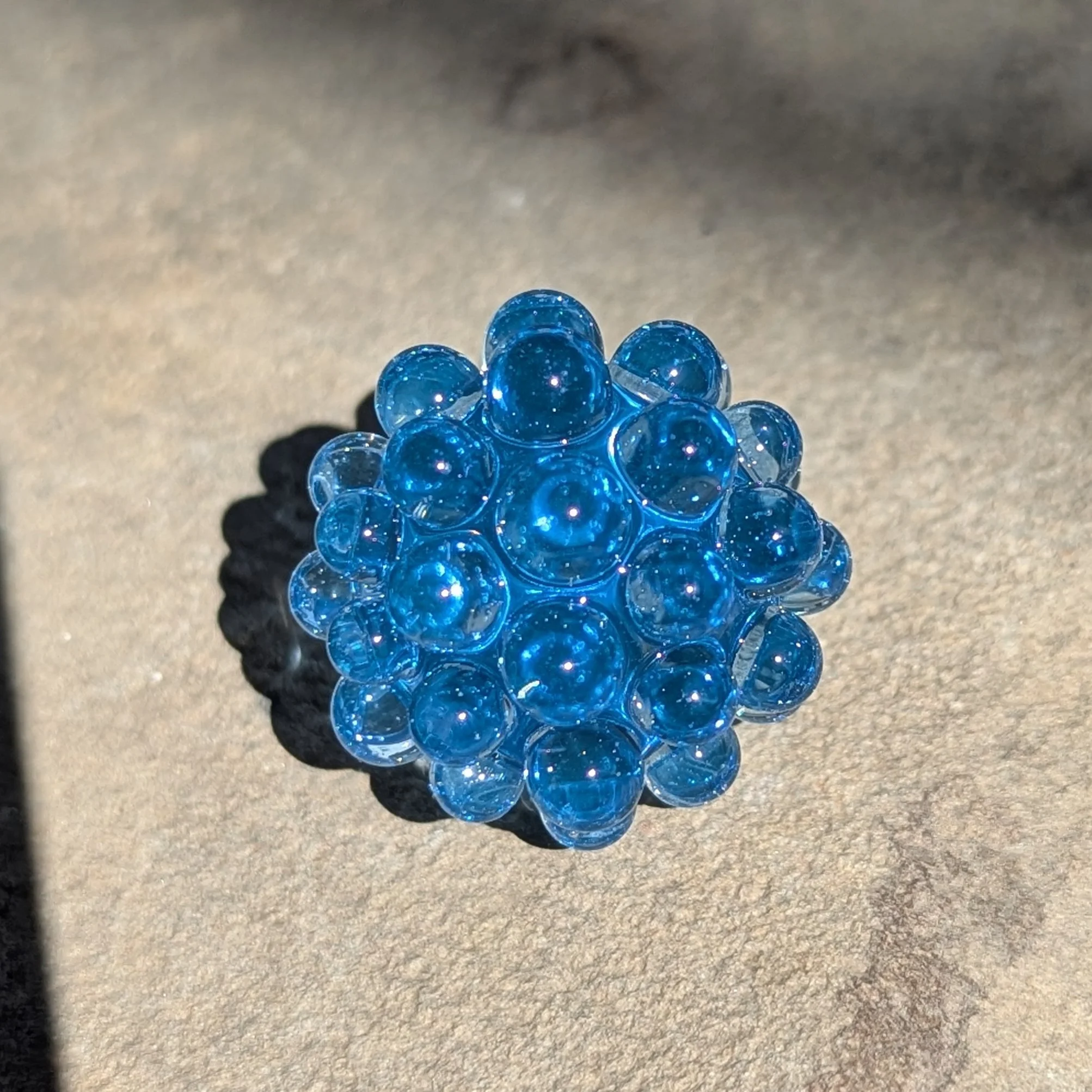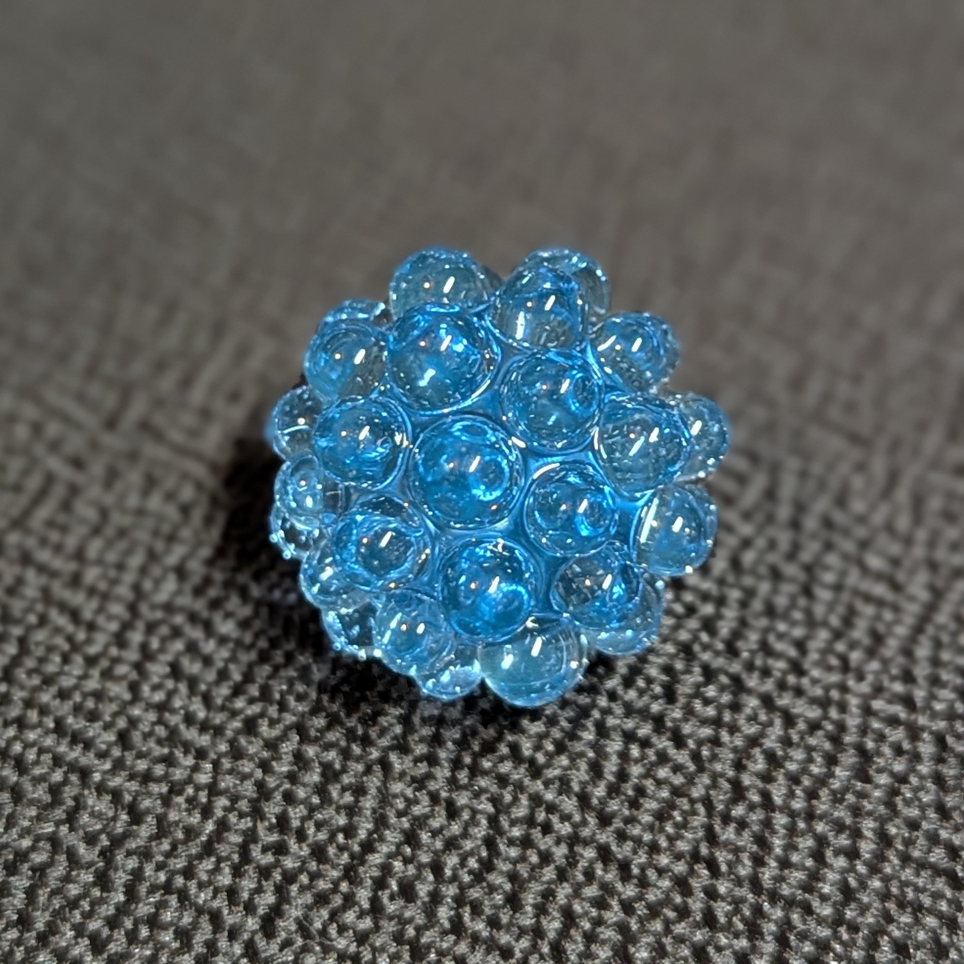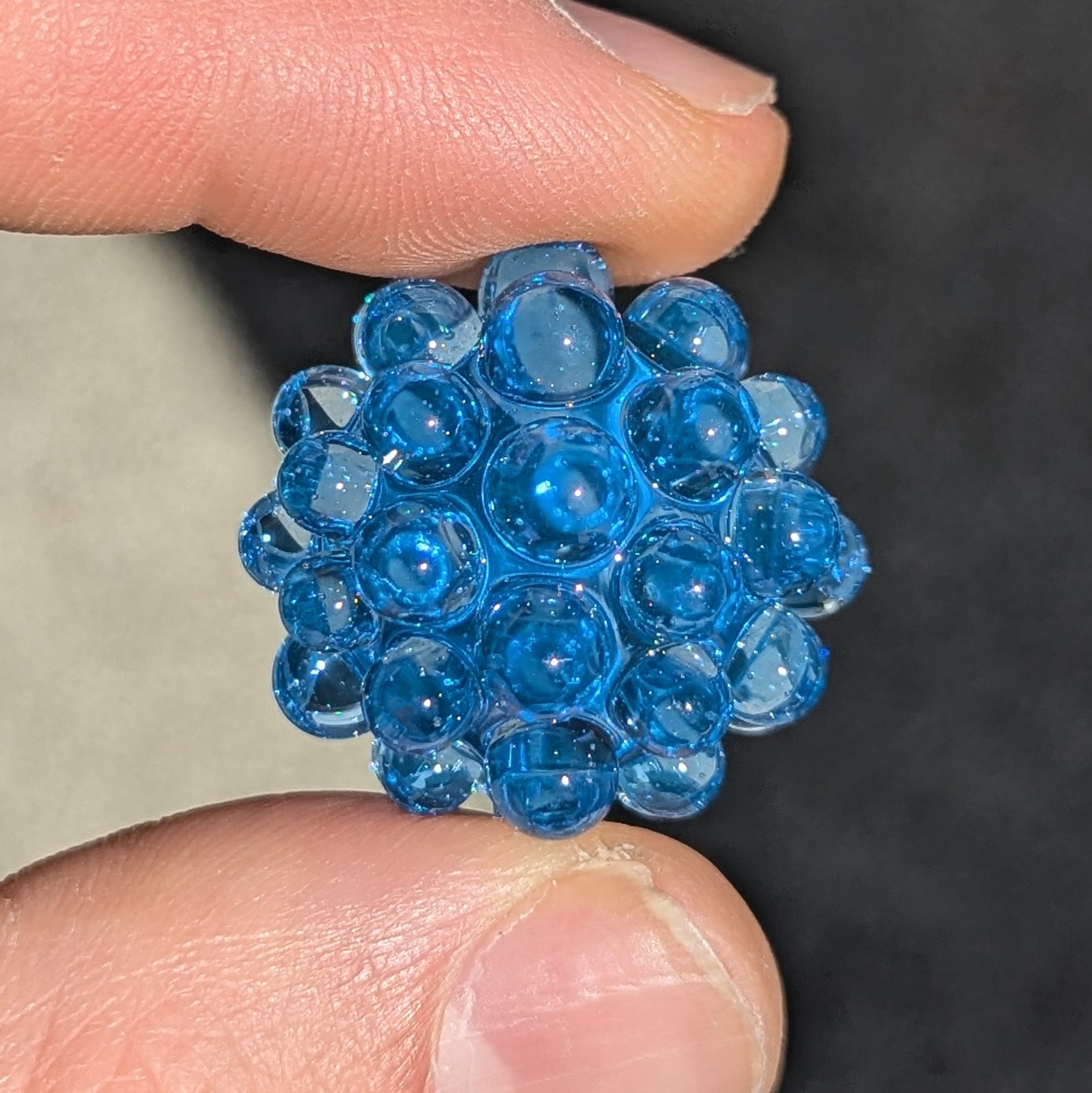 Transparent blue core with matching blue hobnails. I included photos with different lighting scenarios.