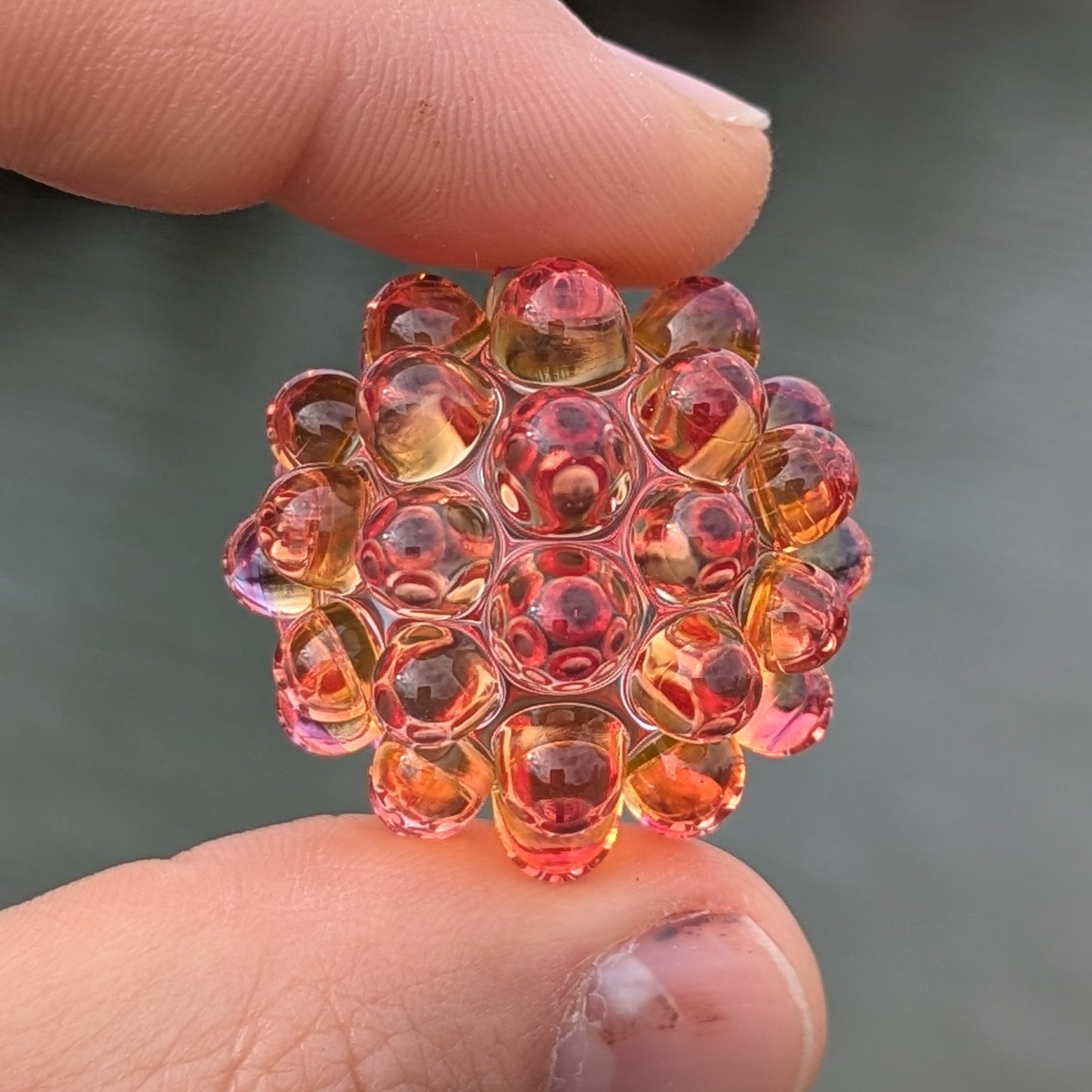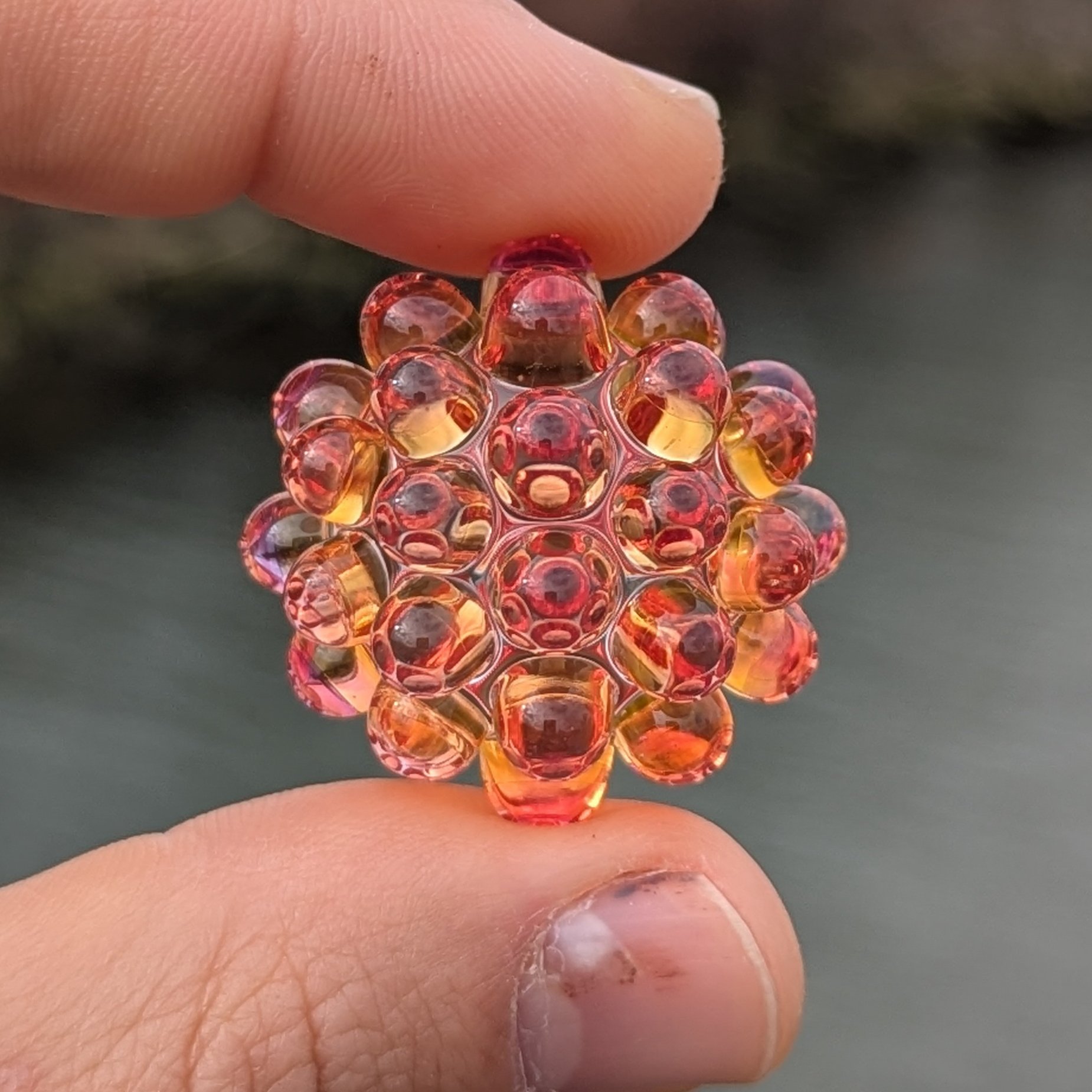 Clear core with layered pink and transparent orange hobnails